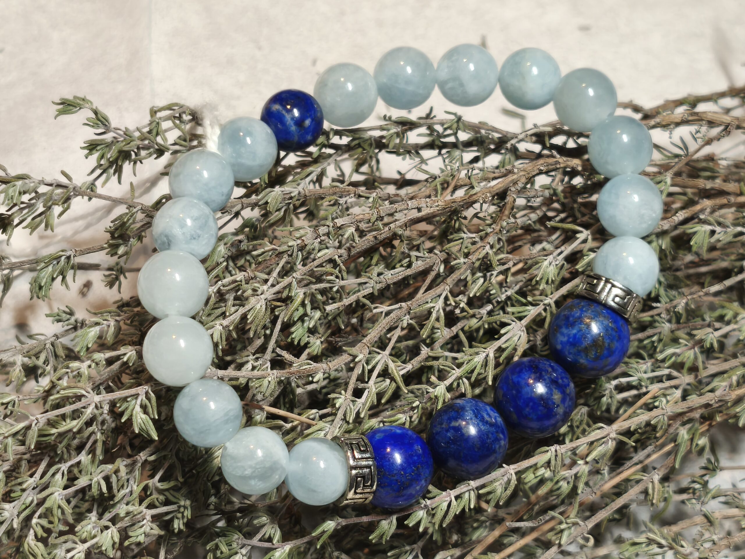 | aigue marine | Aigue marine en perles de 8 mm et Lapis Lazuli en perles de 10mm pour un poignet de 17 à 18 cm. |