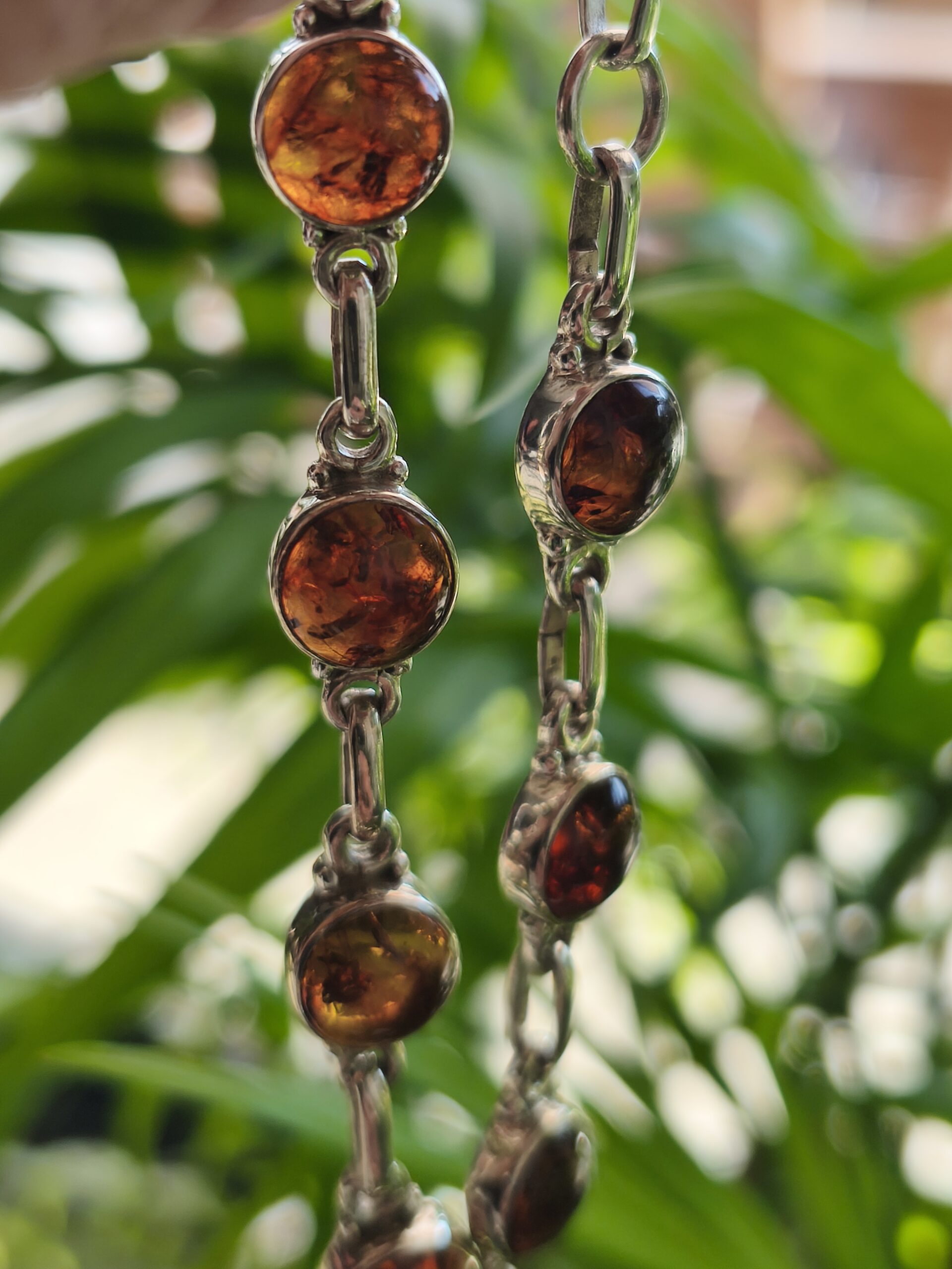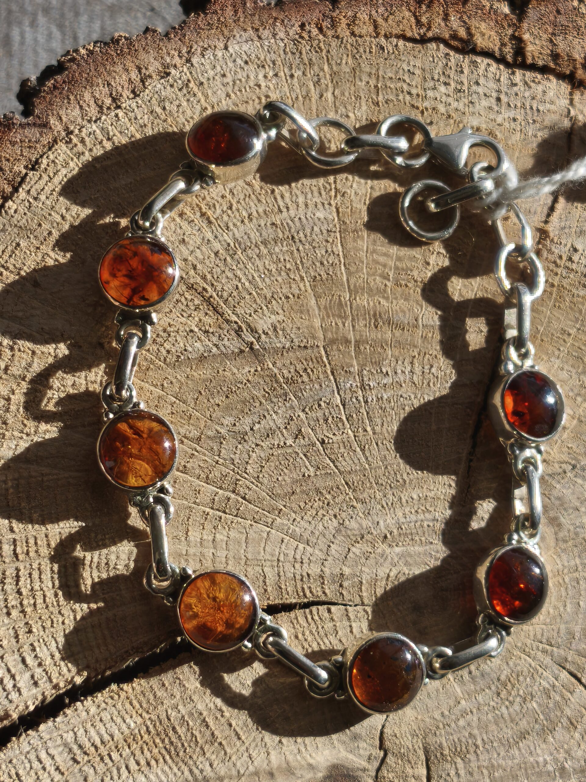 | Bracelet | bracelet en argent composé de sept cabochons ronds en ambre, dimension du bracelet reglable de 18 à 20,5 cm, poids 12 g. l'ambre aide a retablir un climat harmonieux, il est anti-inflammatoire… |