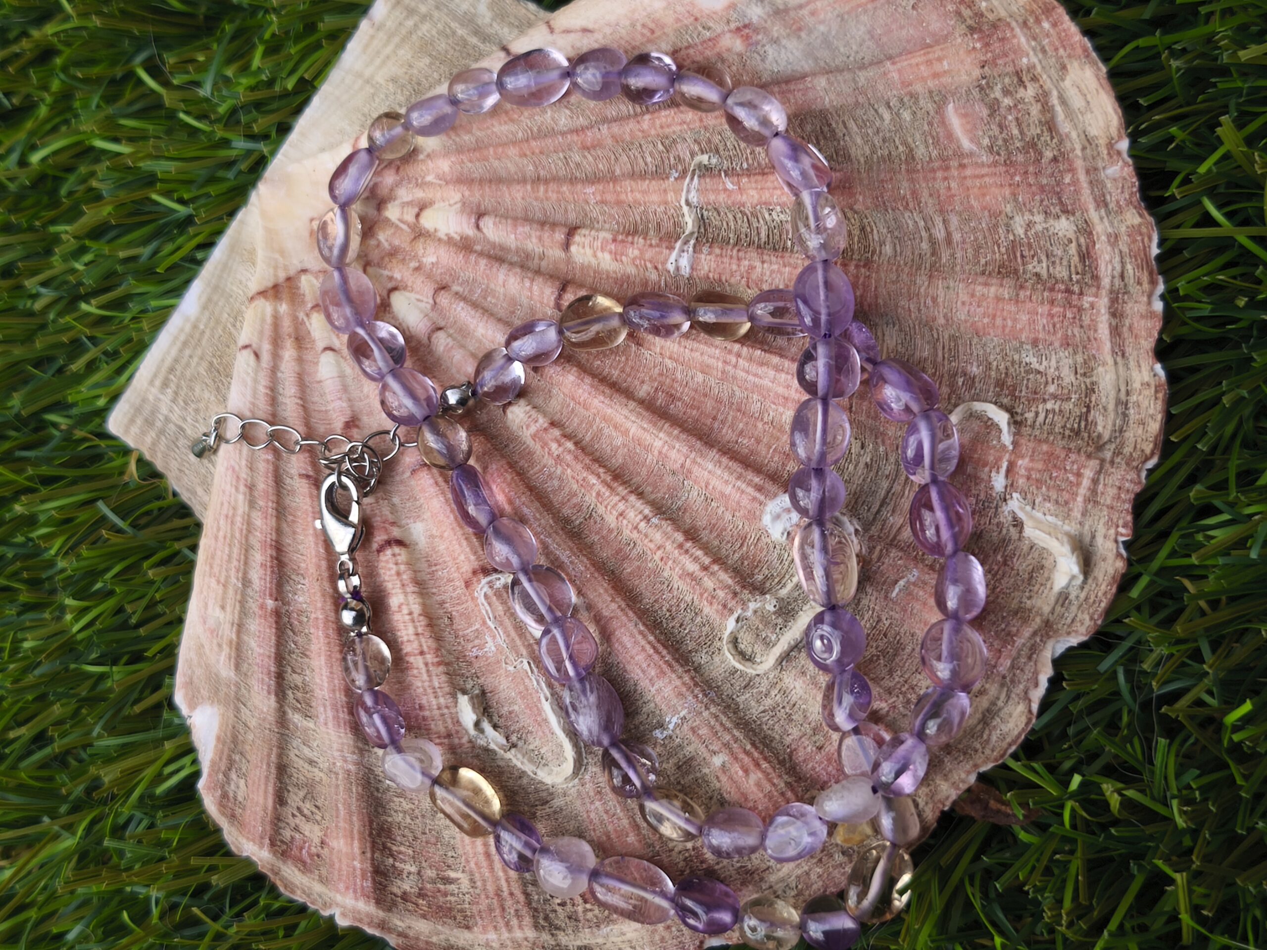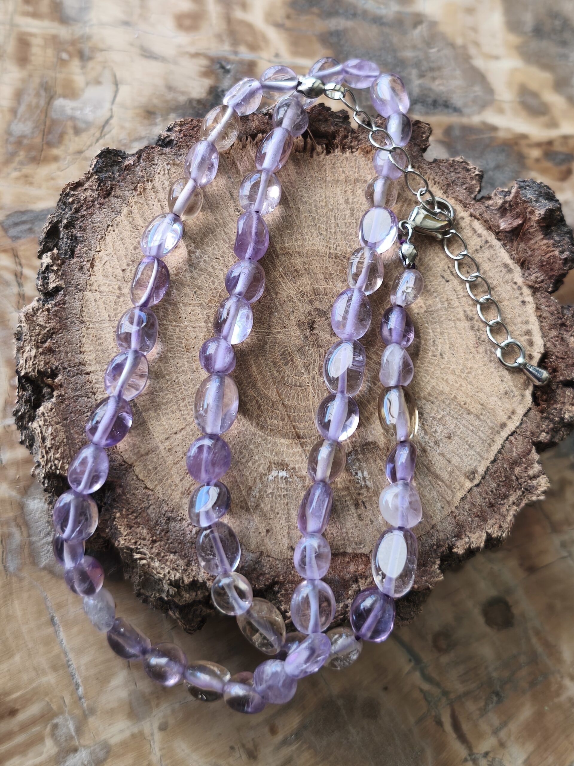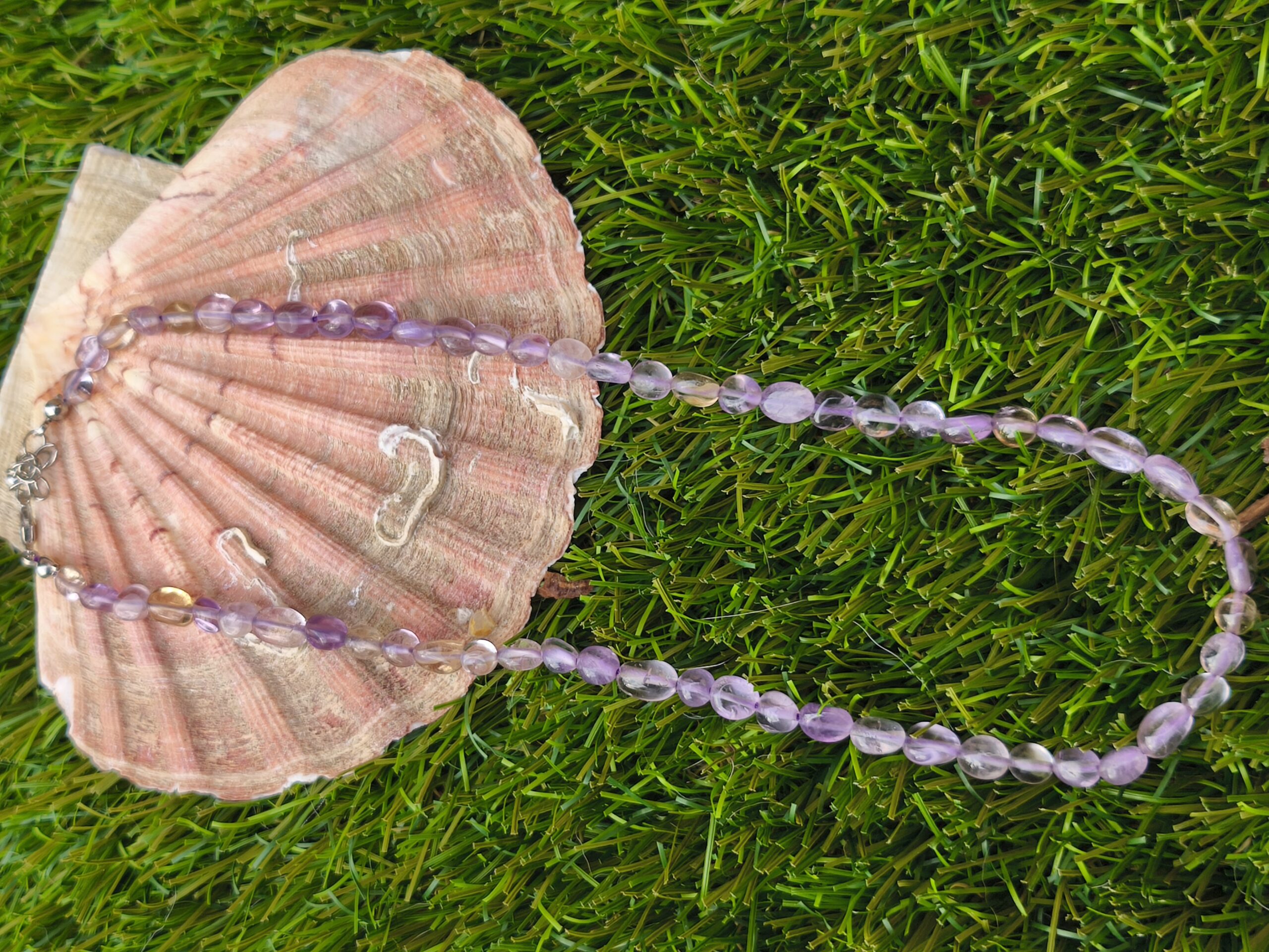| collier | collier en ametrine perles ovales, longueur reglable grace a la chainnette de 43 à 48 cm. l'ametrine est une pierre semi-precieuse rare, née du mariage naturel de l'amethyste et de la citrine. |