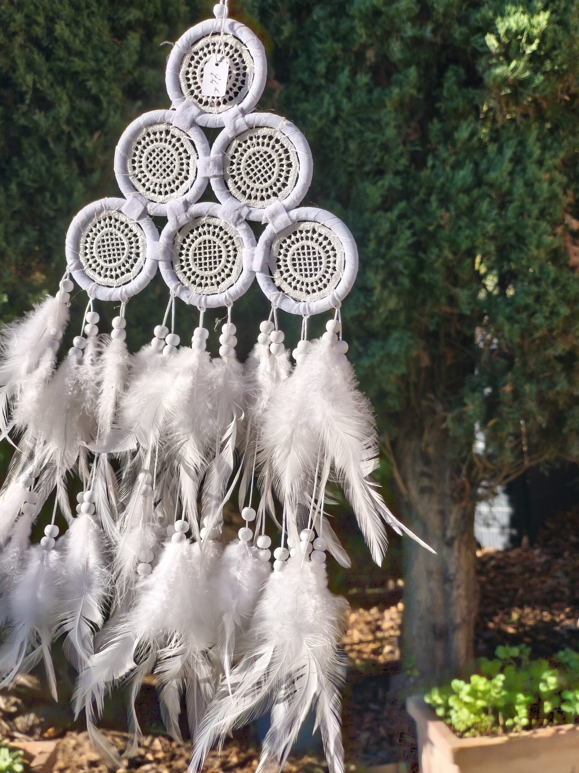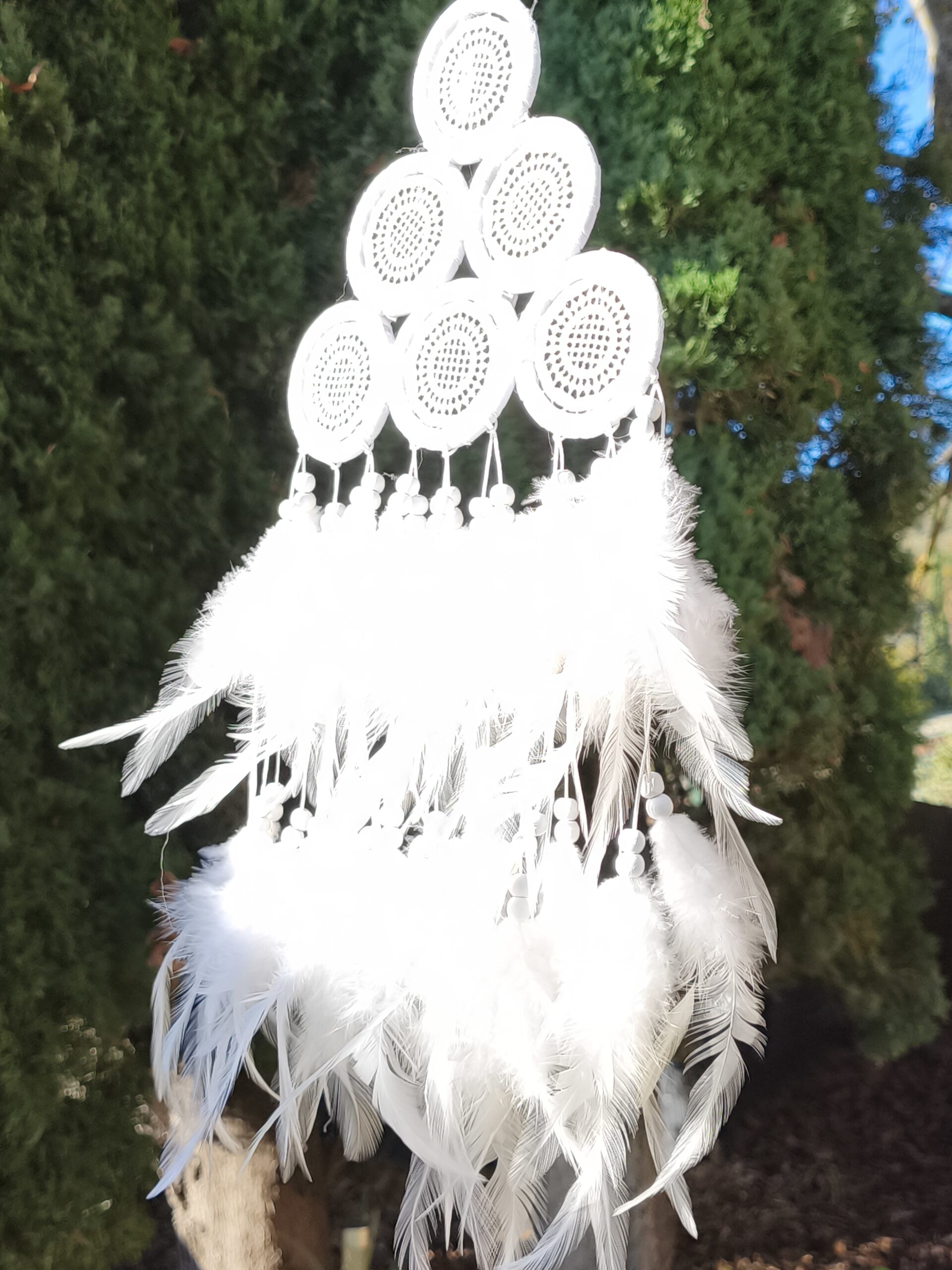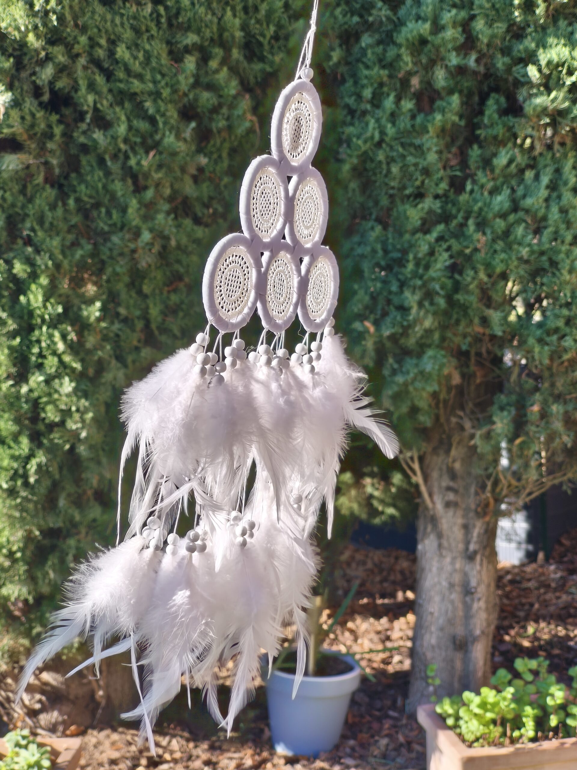 | attrape reve | attrape reve blanc avec plumes, longueur totale 56 cm x 18 cm. composé de 6 petits cercles et plumes |