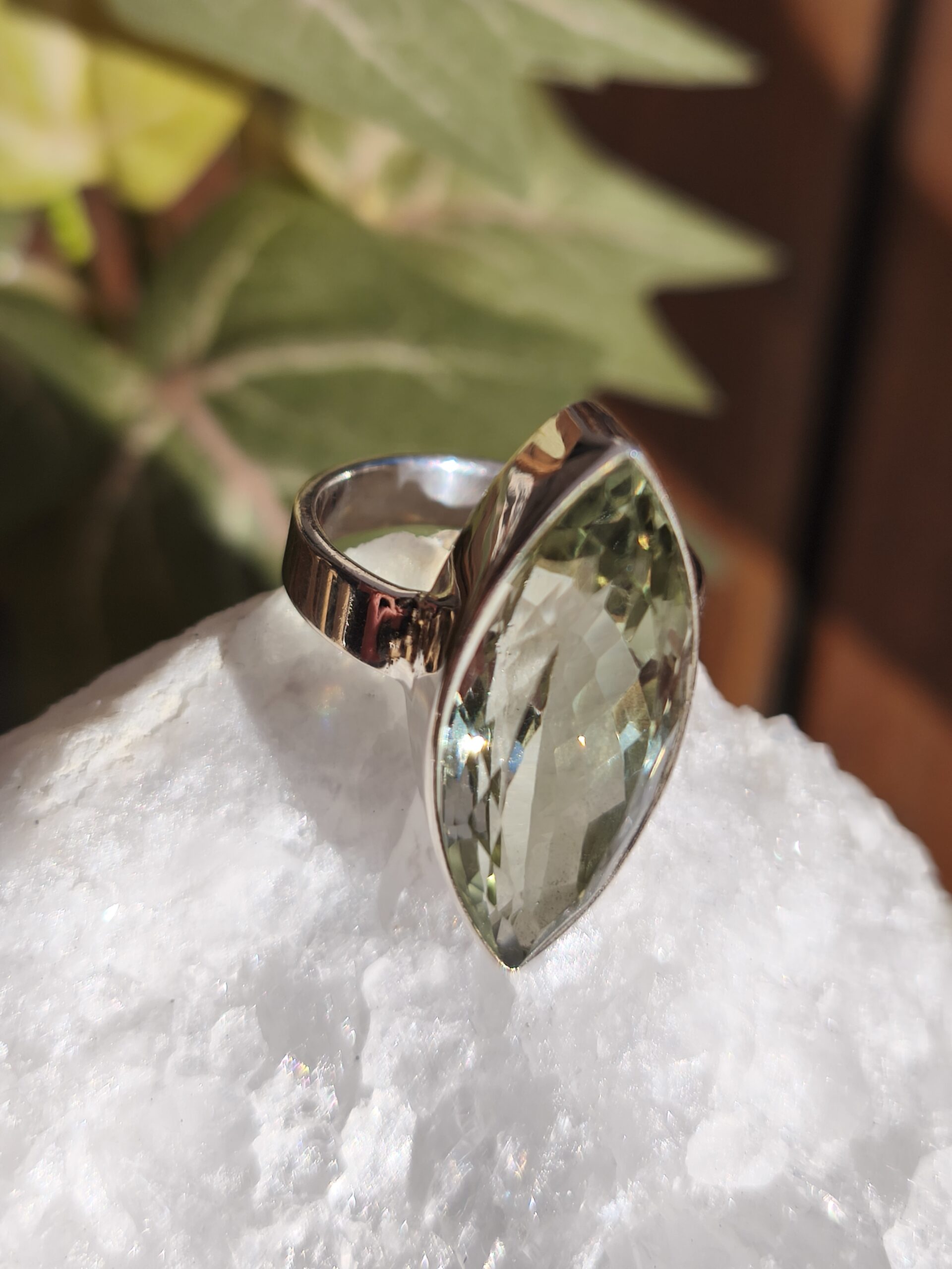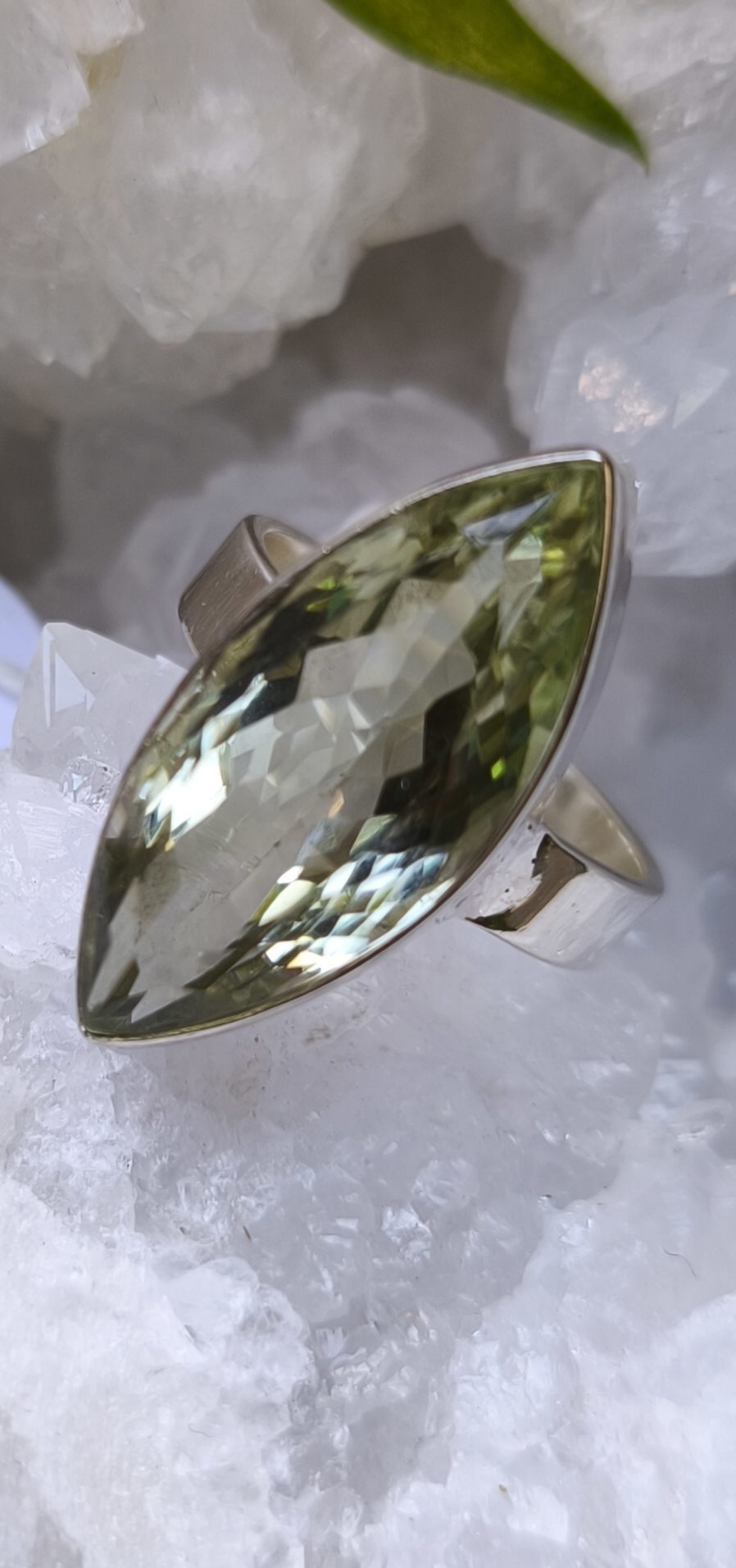magnifique bague en amethyste verte forme "calisson" montee sur argent.