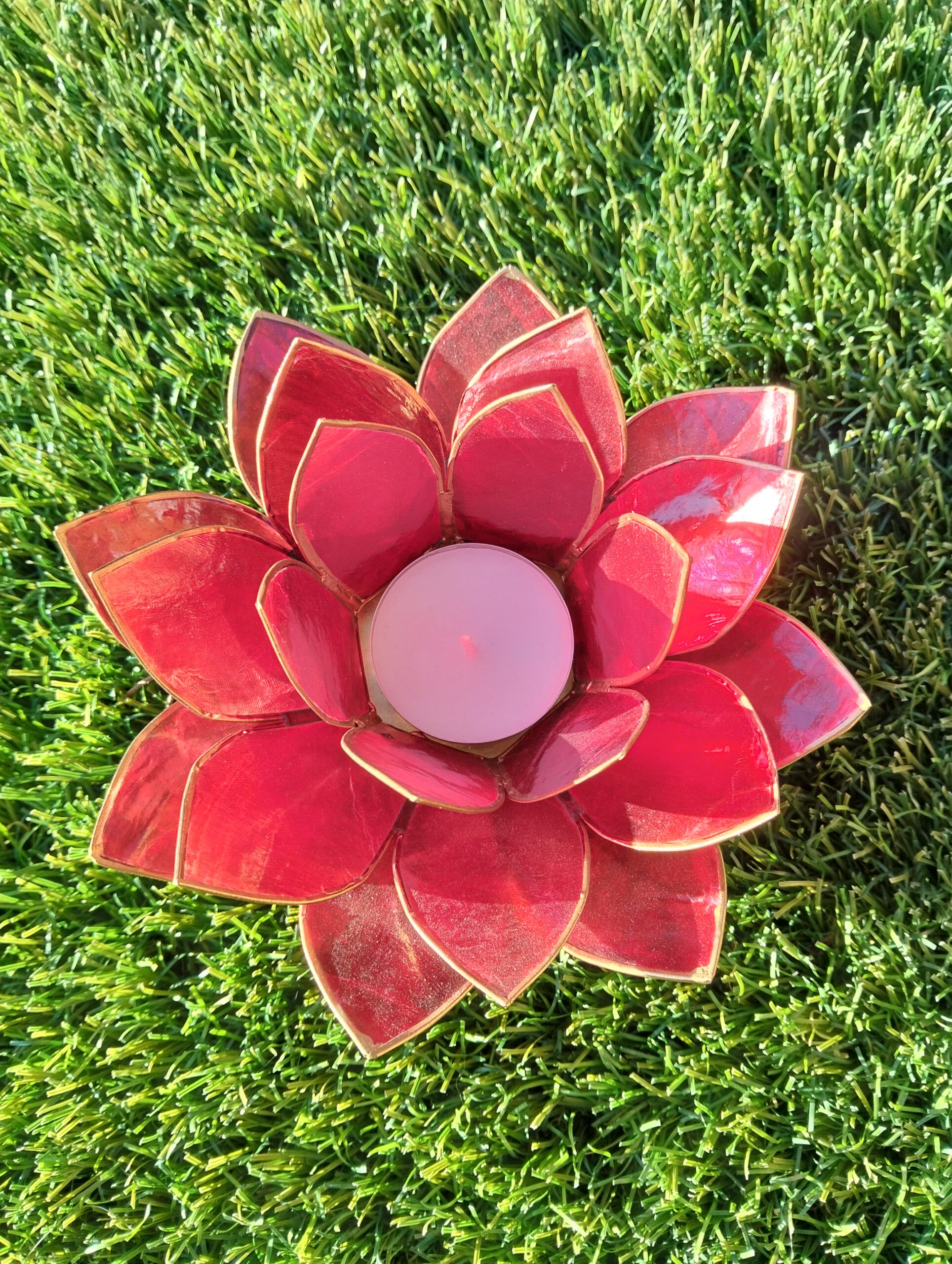 | bougeoir | bougeoir en nacre fleur de lotus rouge signifie passion, amour vitalite et force, relié au chakra racine (muladhara) |