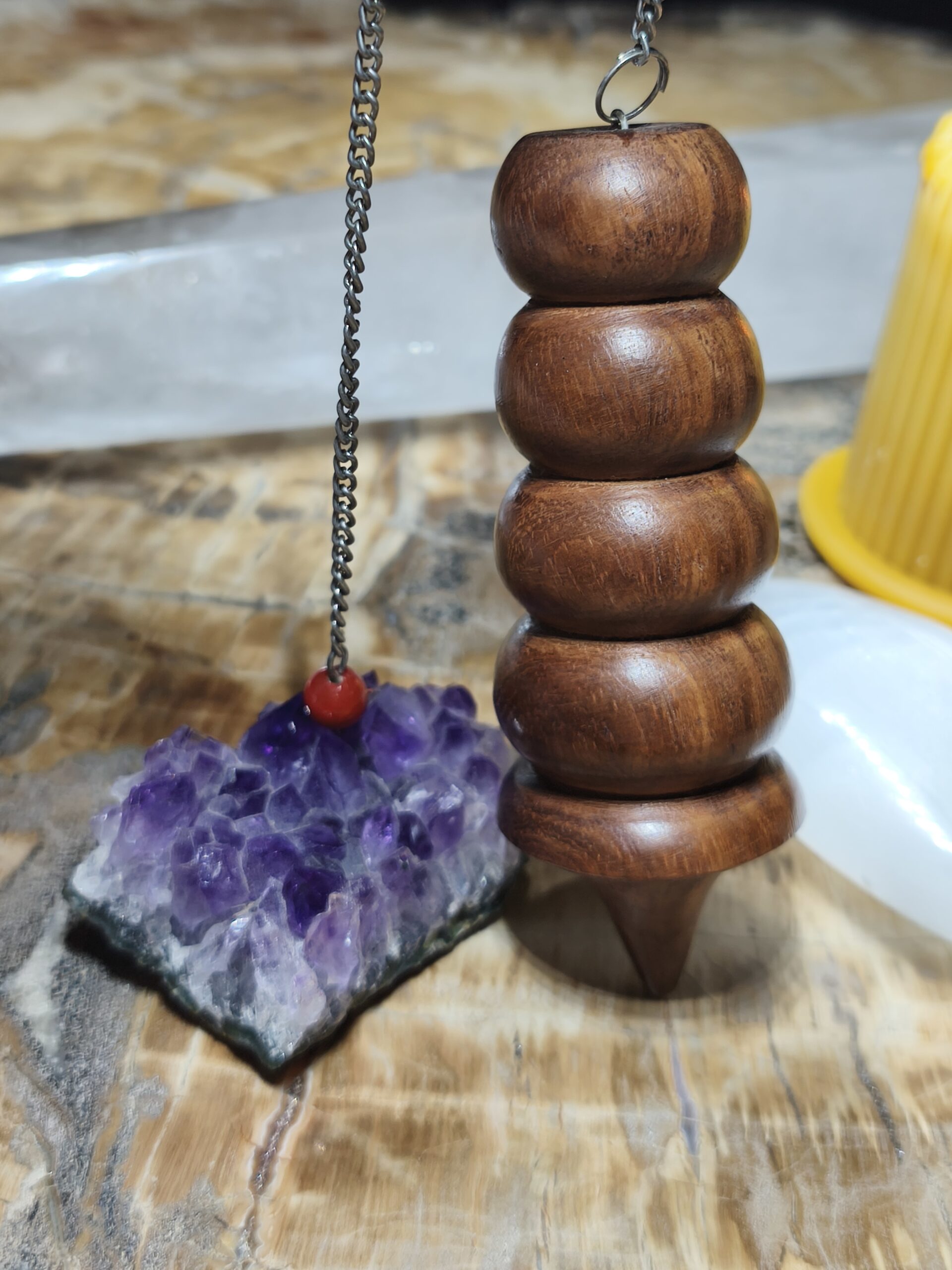 gros pendule en bois longueur du pendule 10 cm, longueur de la chainette 17 cm, longueur totale 27 cm