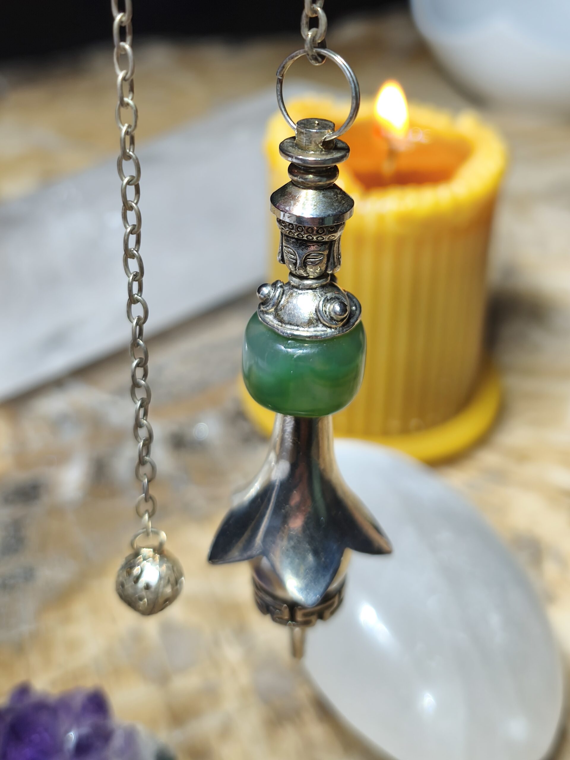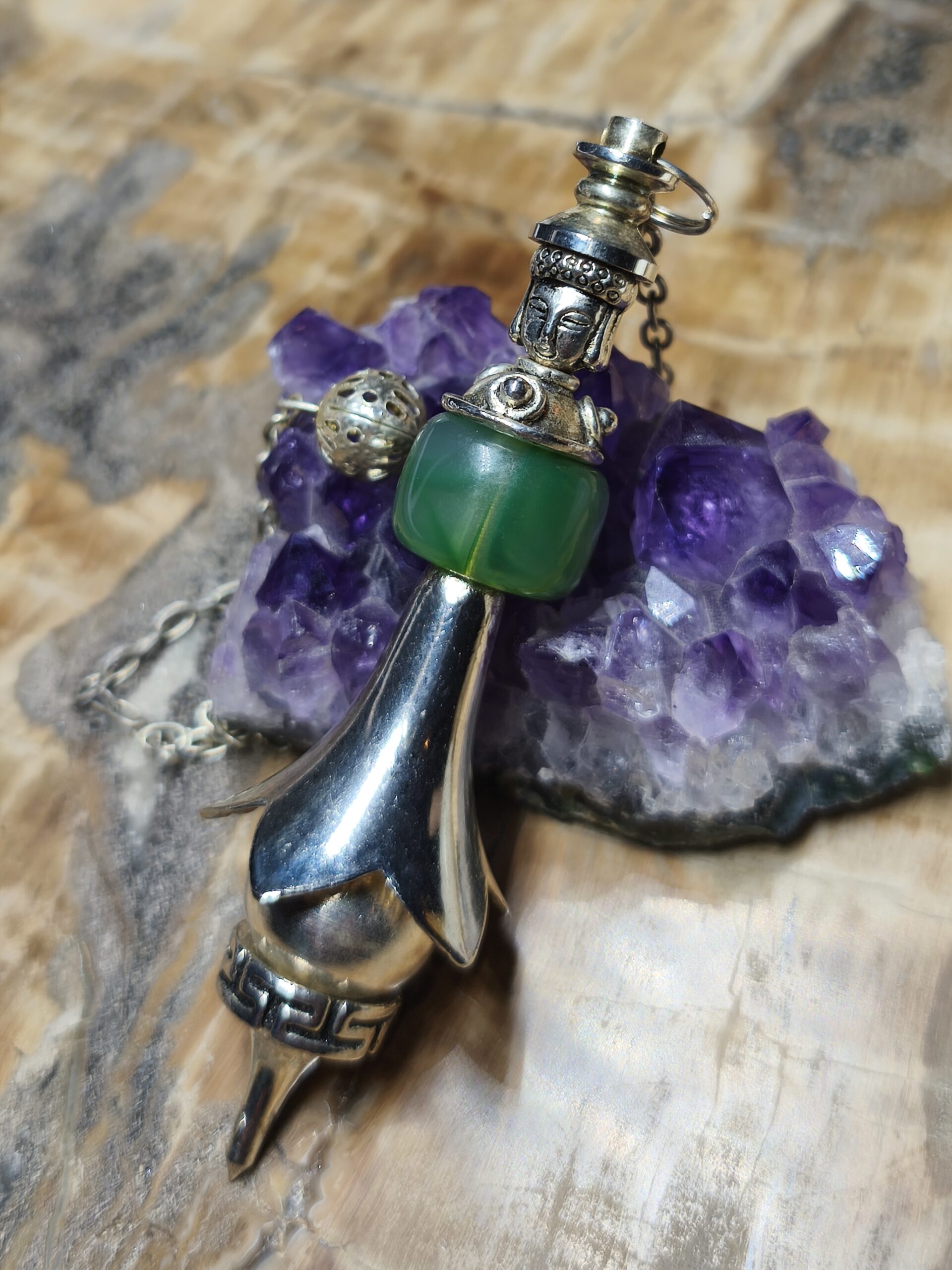 | pendule | pendule bouddha metal argenté et aventurine verte, |