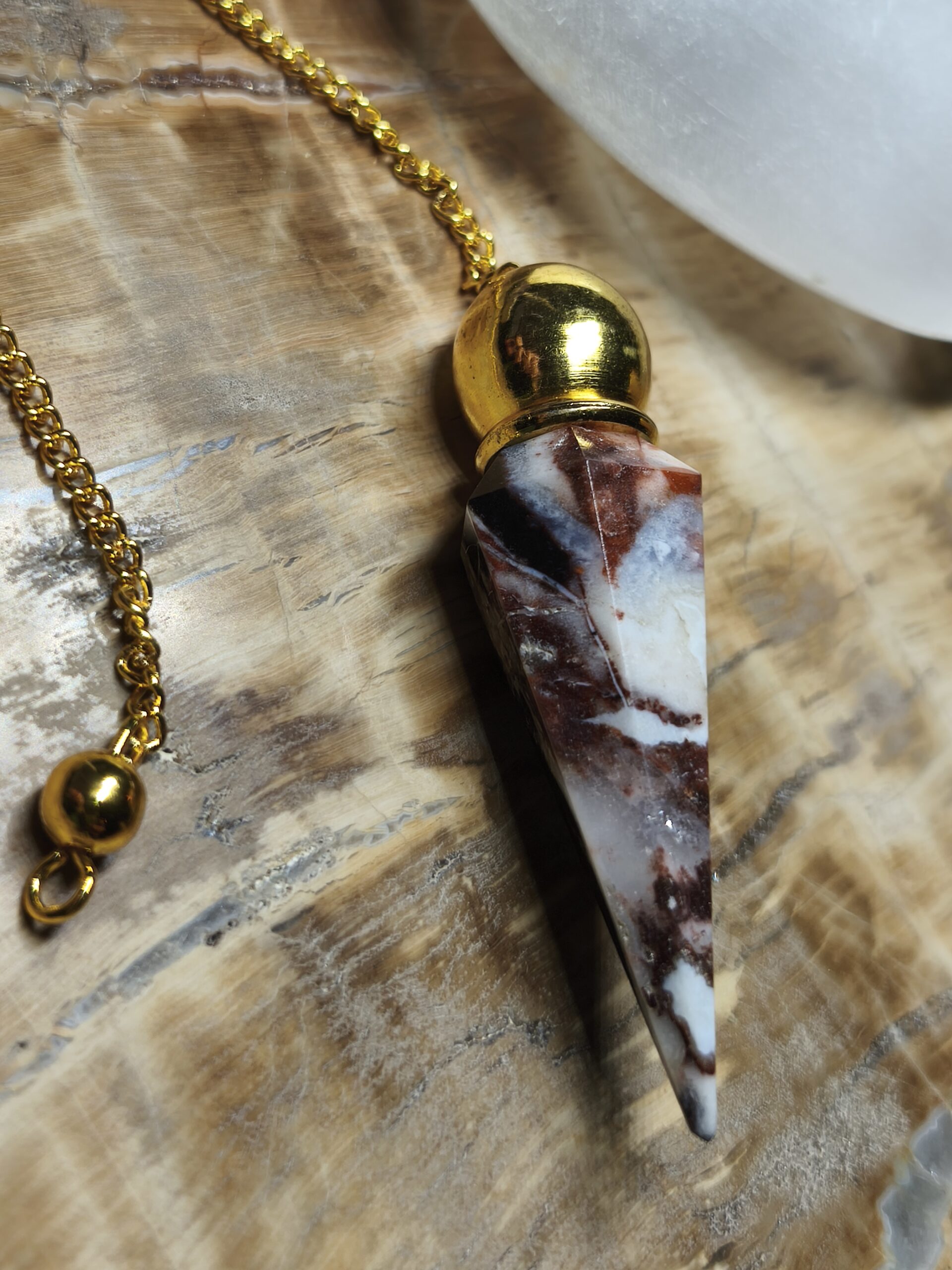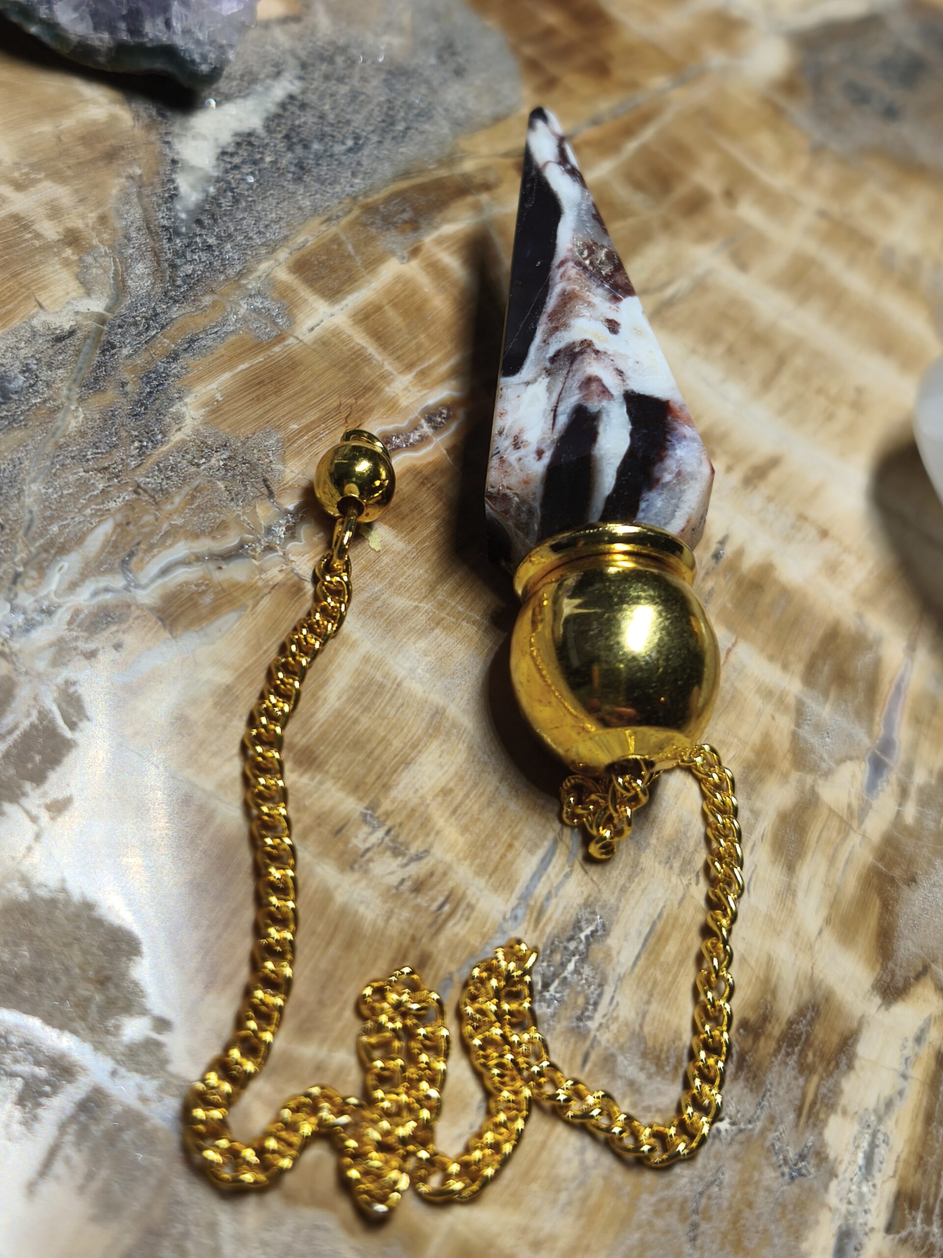 | Pendule | pendule doré en jaspe arc en ciel, le jaspe arc en ciel aide a avoir un esprit clair et organise, il favorise la concentration et l'intellect. |