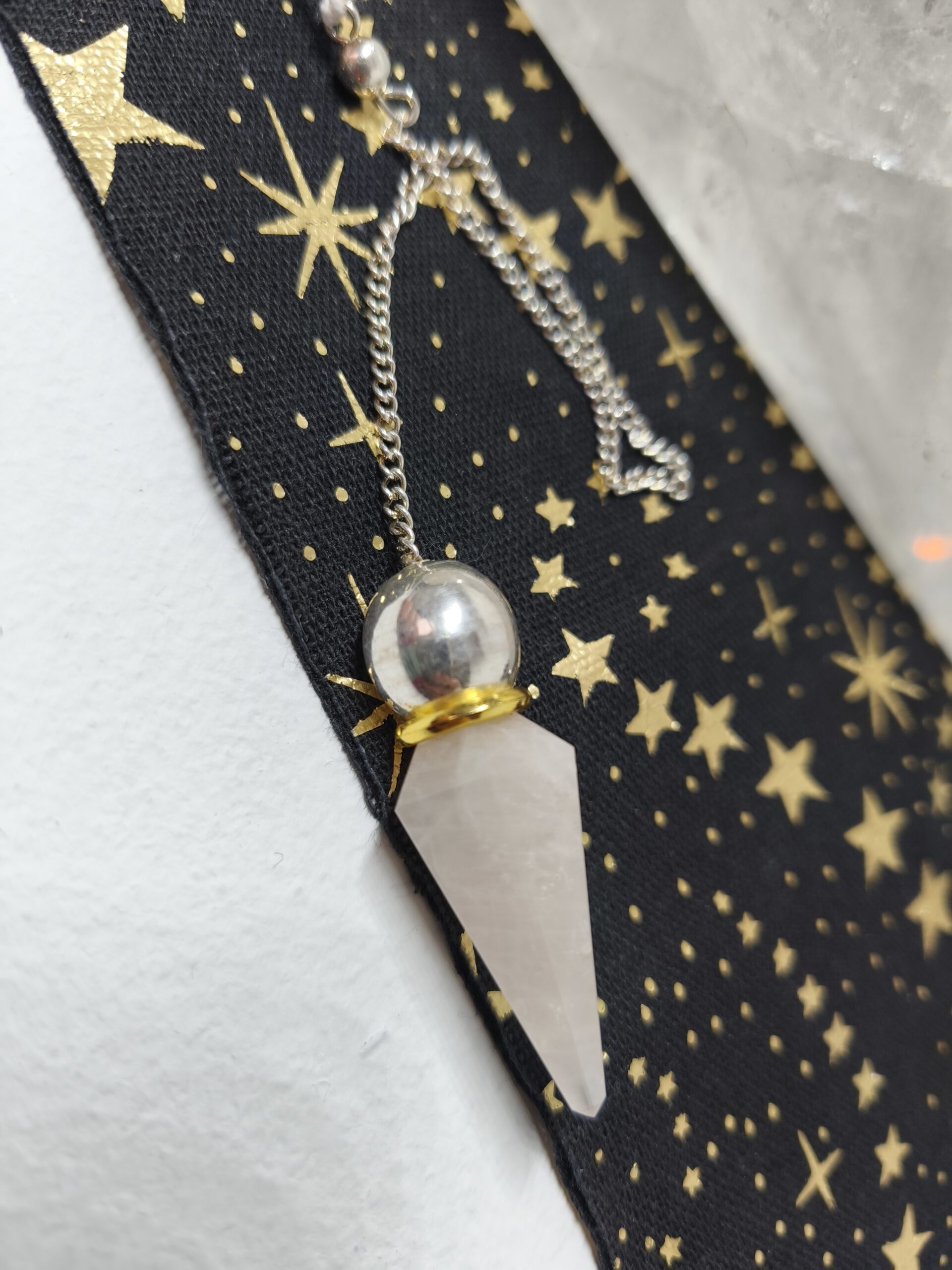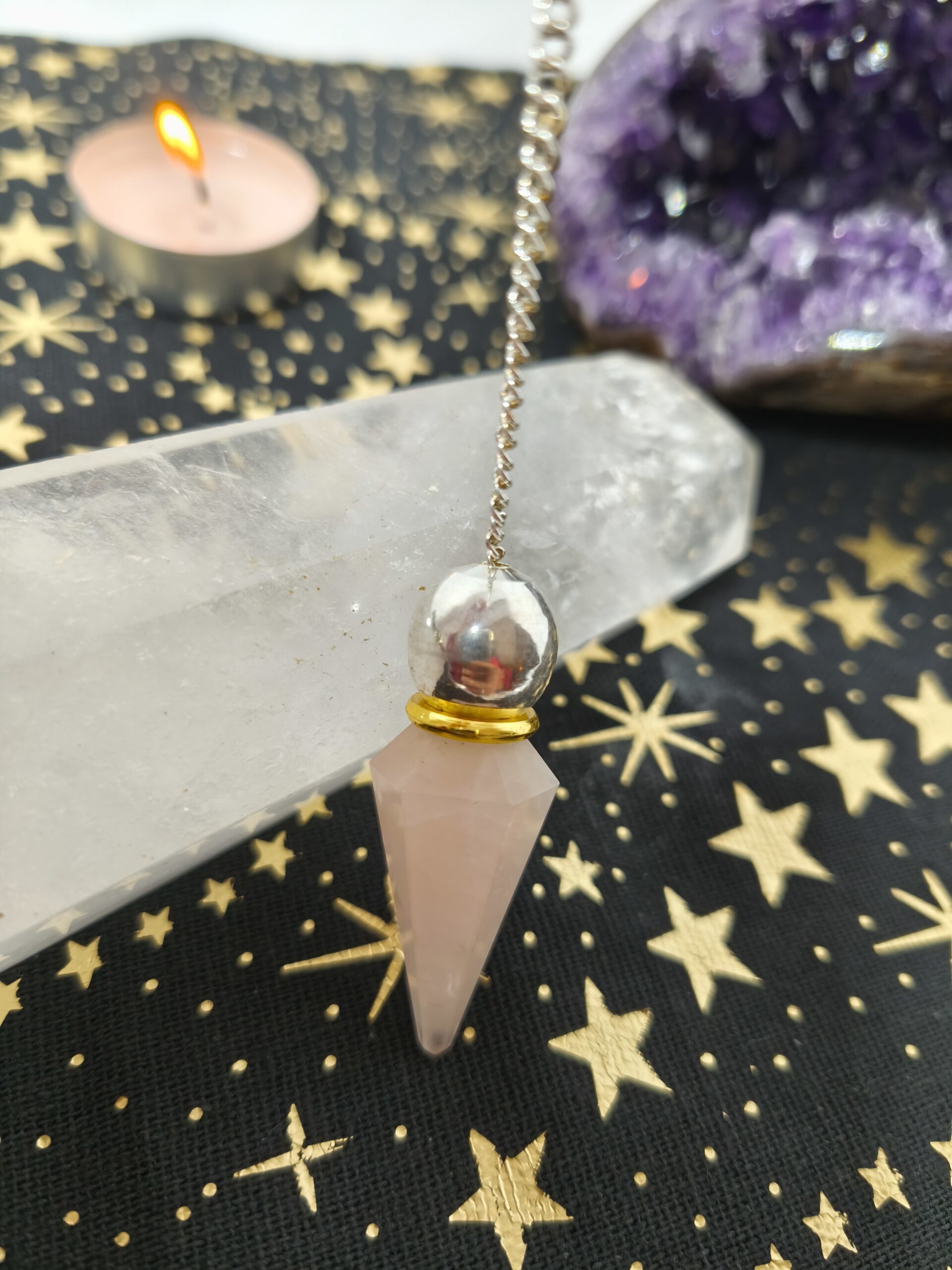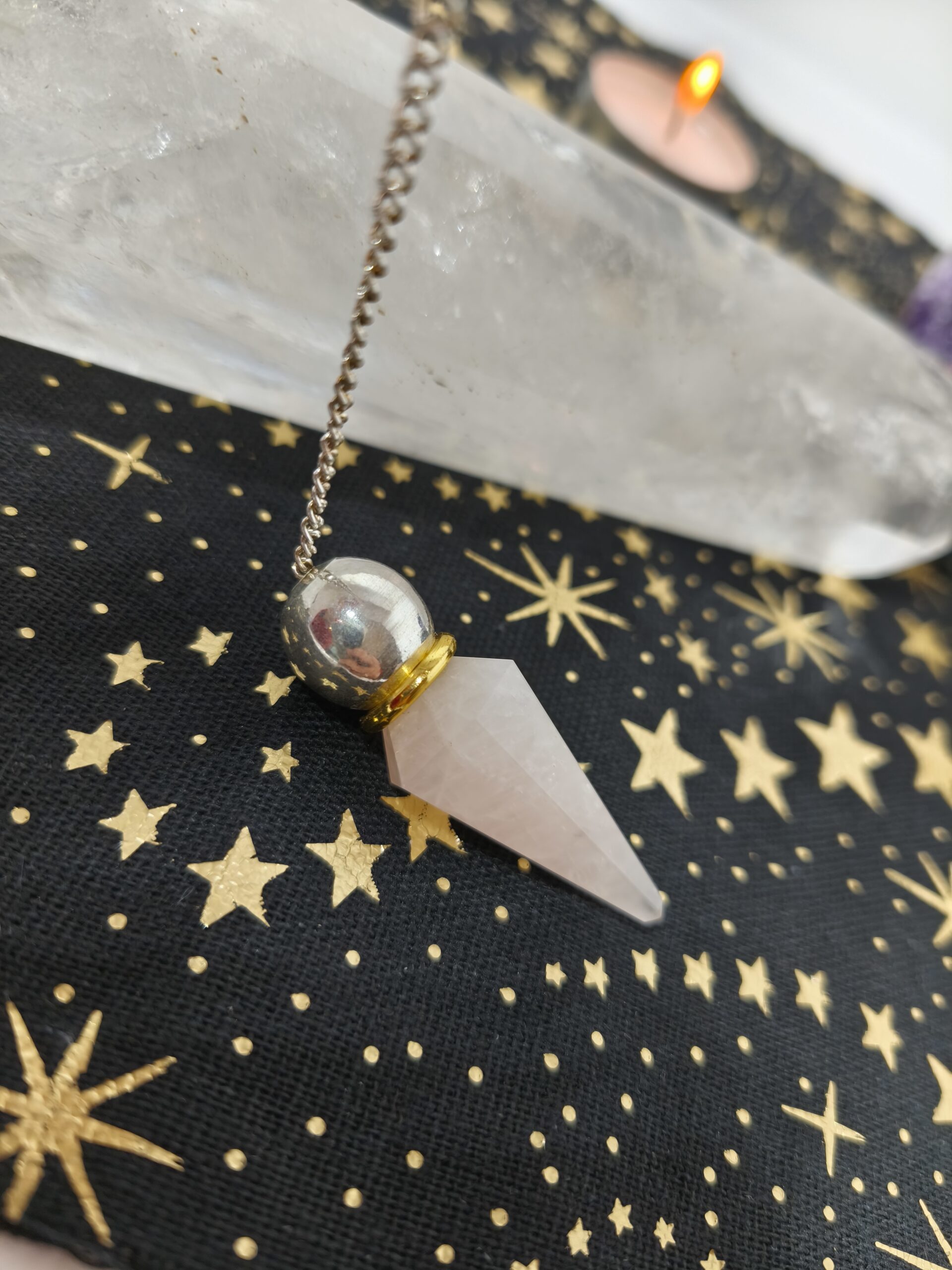 quartz rose pendule exagonal et sphere metal