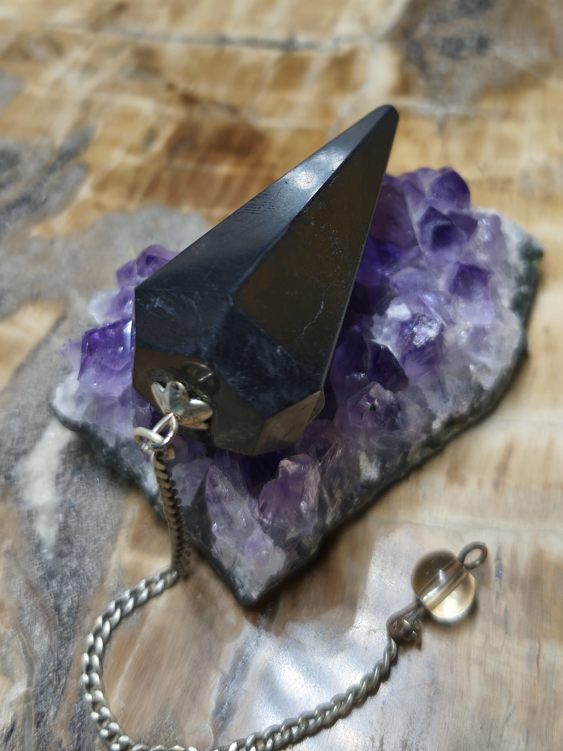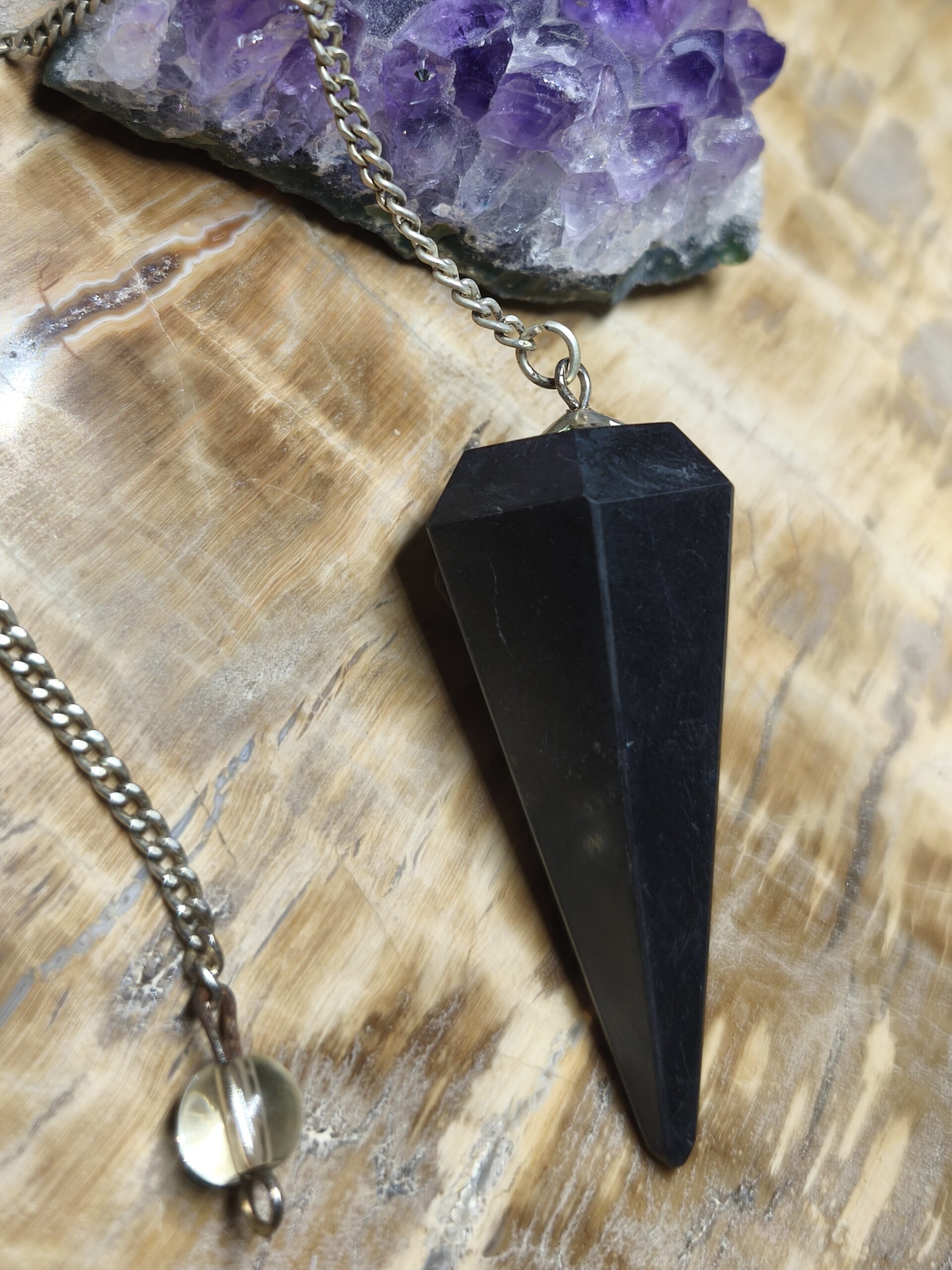 | Pendules | Pendule hexagonal en shungite. Longueur totale 22 cm, longueur de la chainette 16 cm. |
