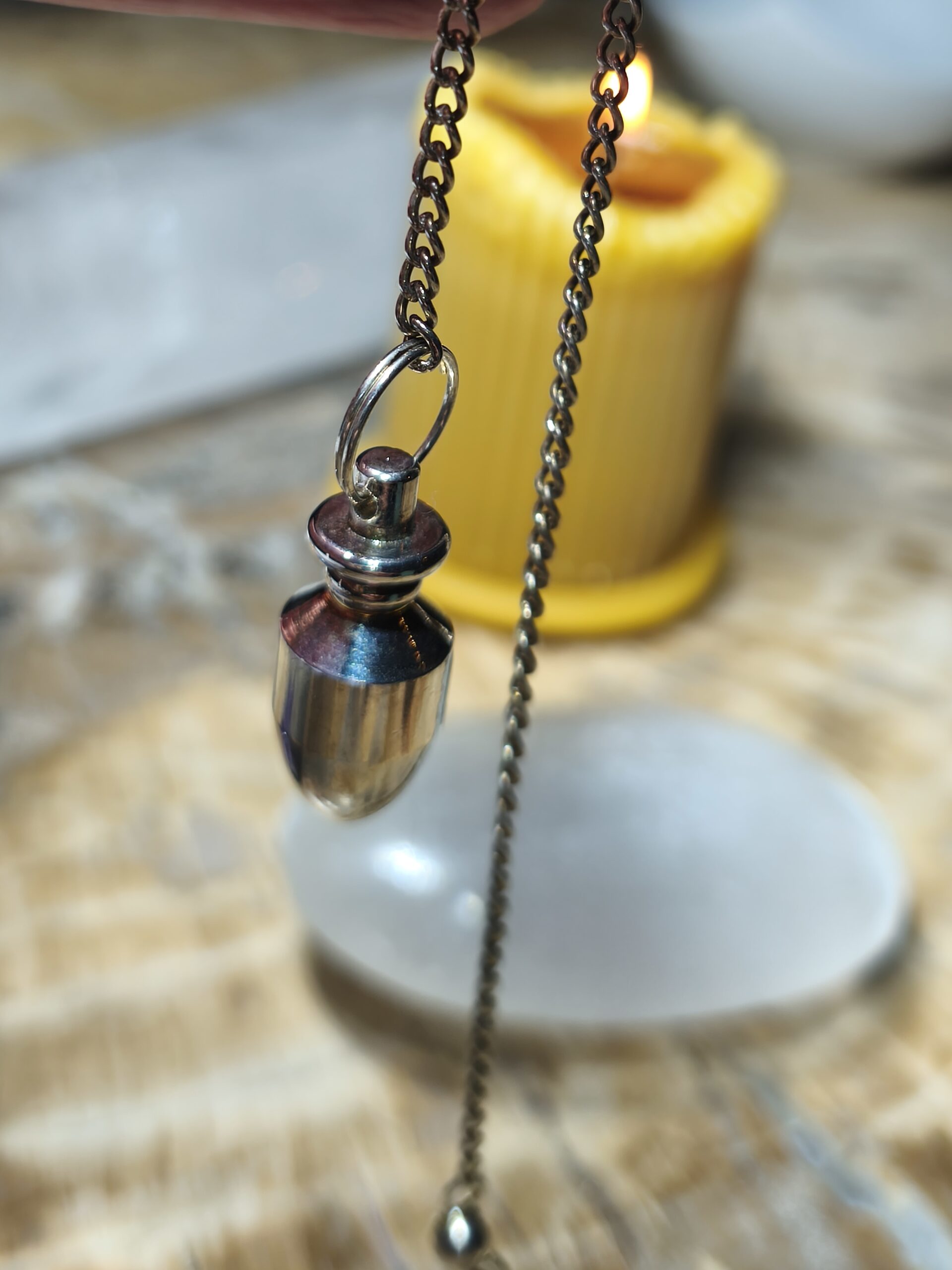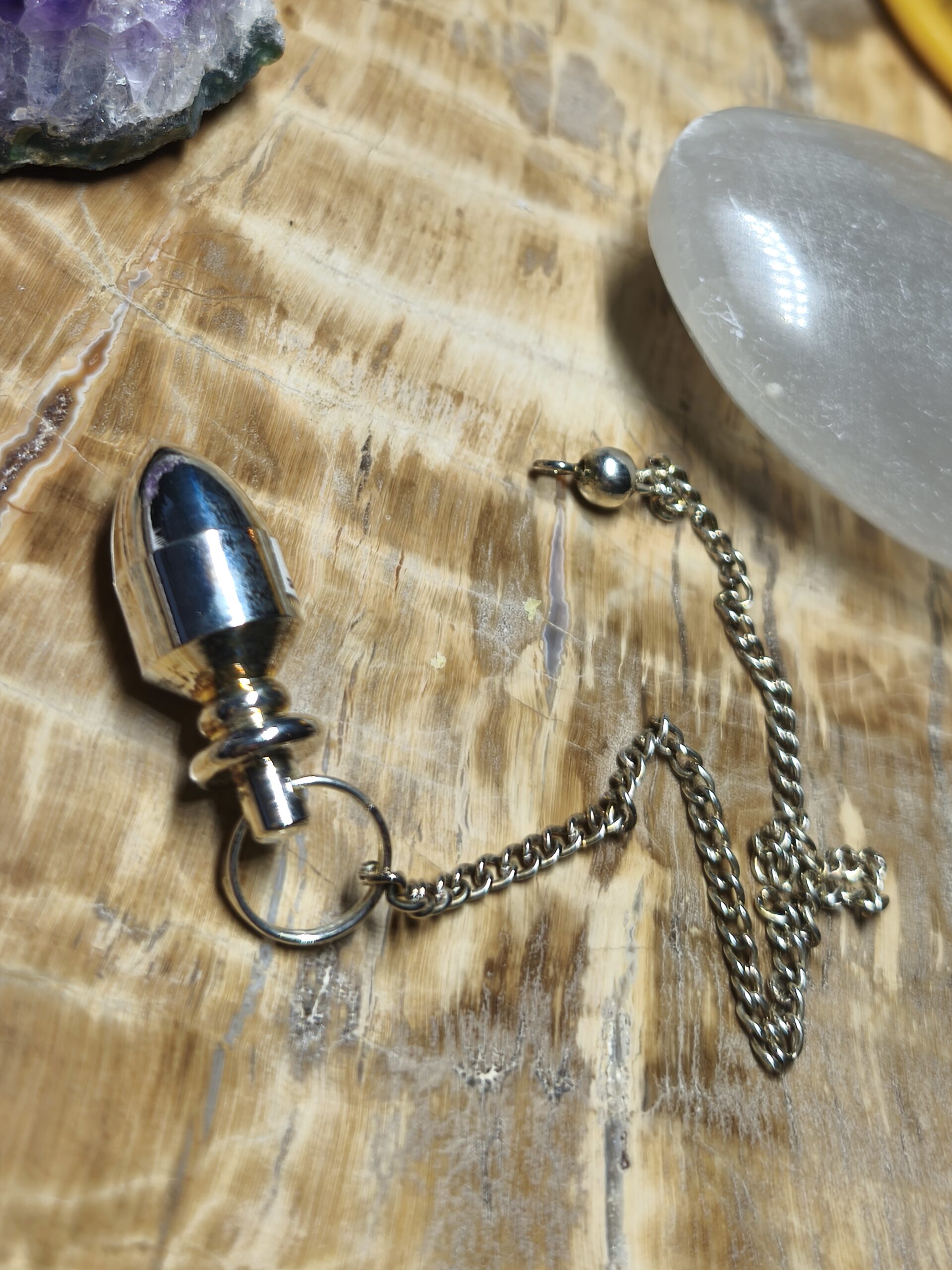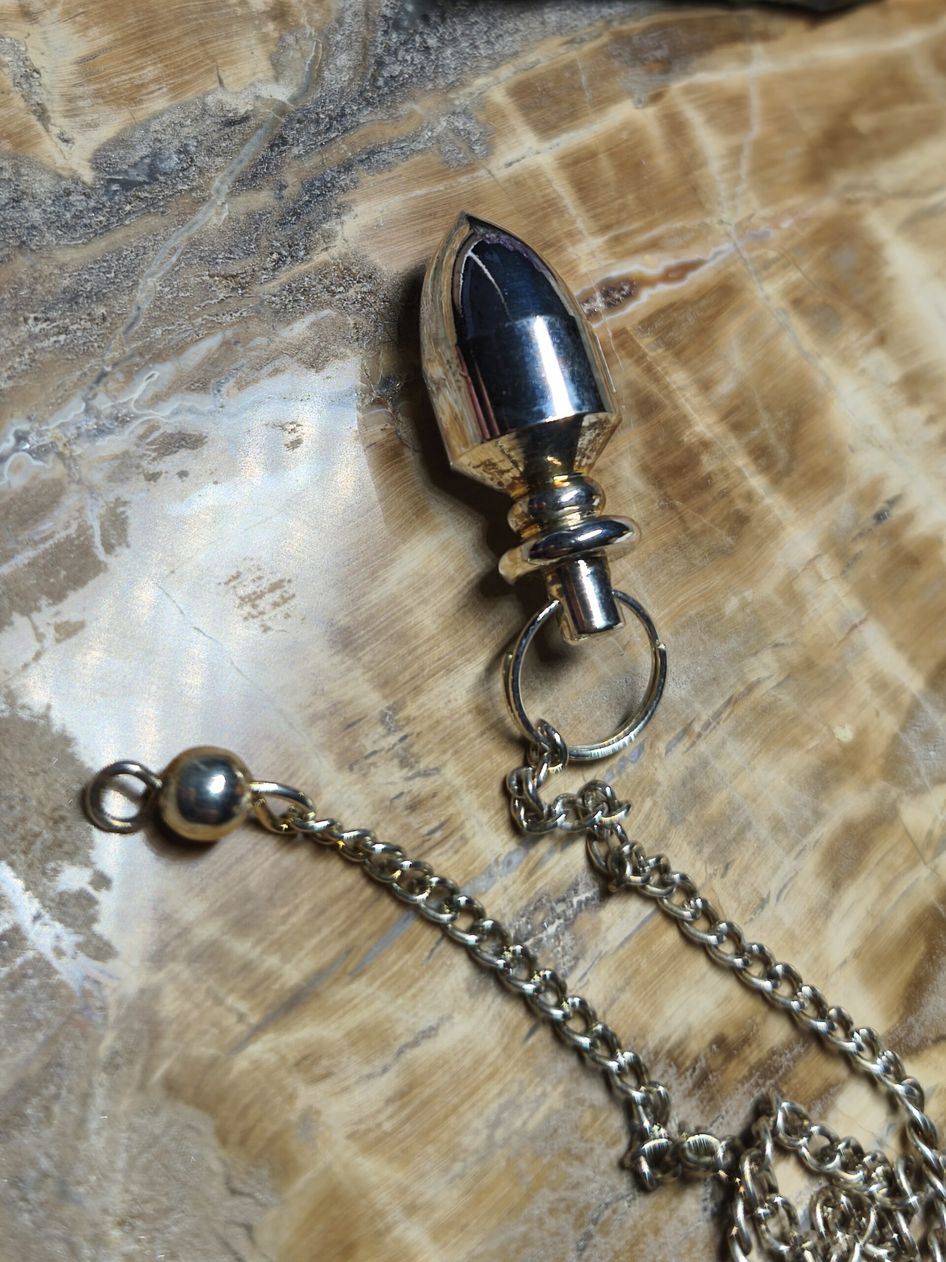 pendule pointe metal, longueur de la chainette 16 cm, longueur totale 19 cm.