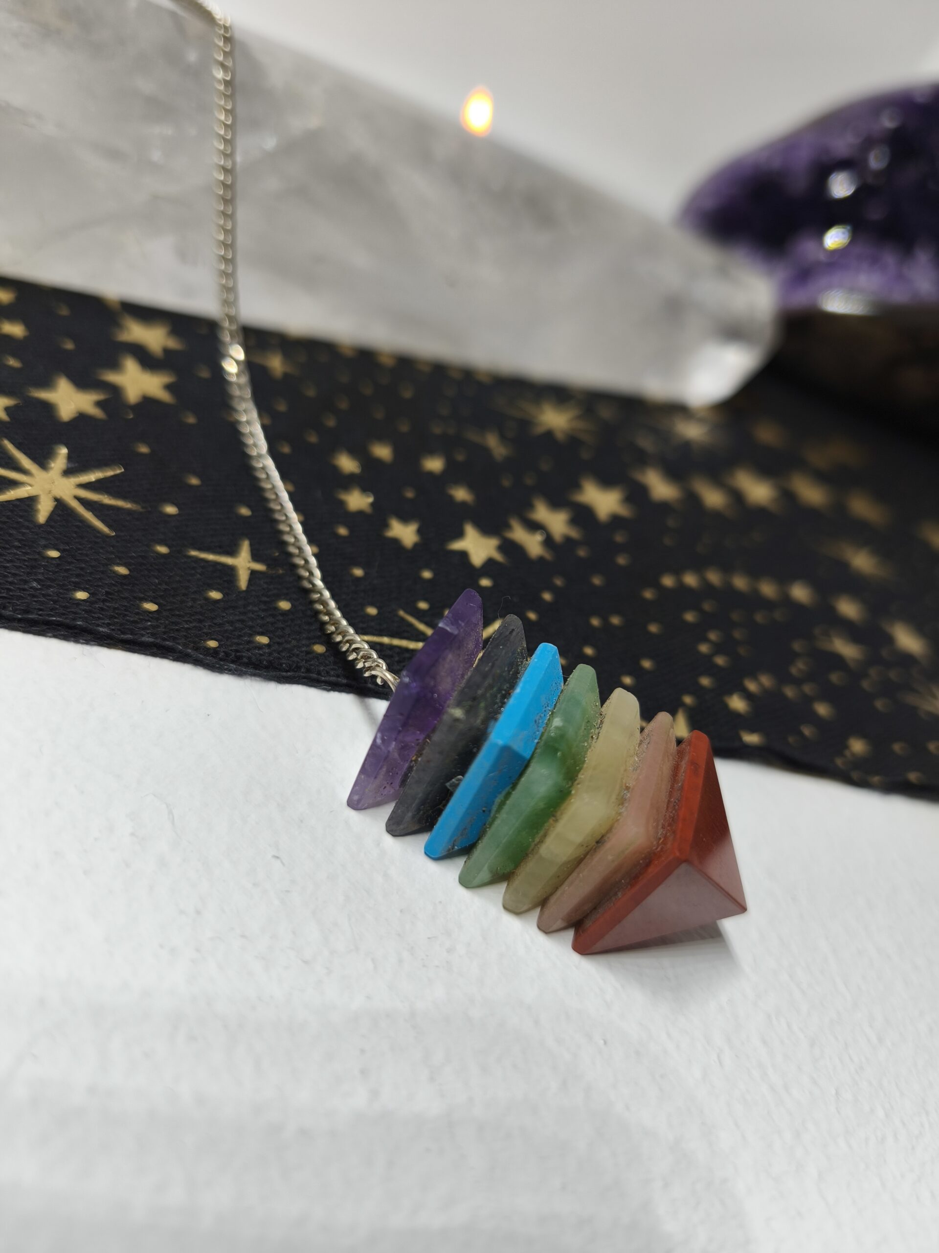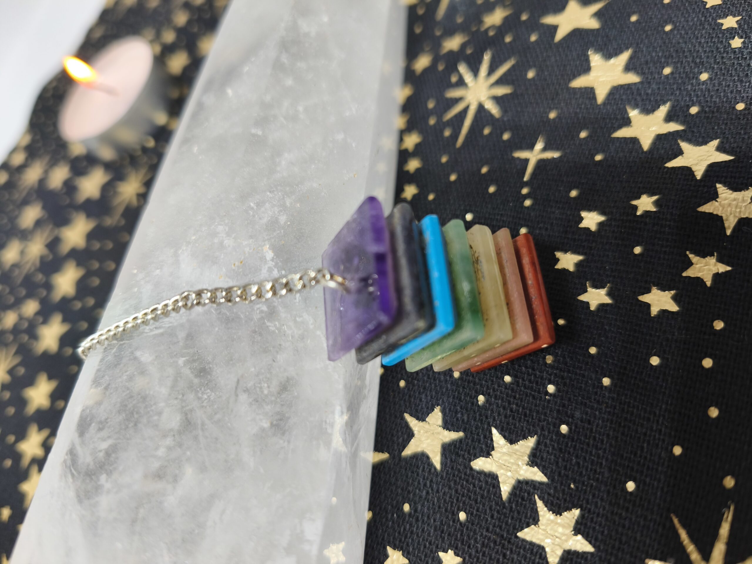 | Pendules | Pendule 7 chakras parfait pour les soins énergétiques mais convient aussi pour tout autre travail. Longueur totale 22 cm, longueur de la chaînette 16 cm. |