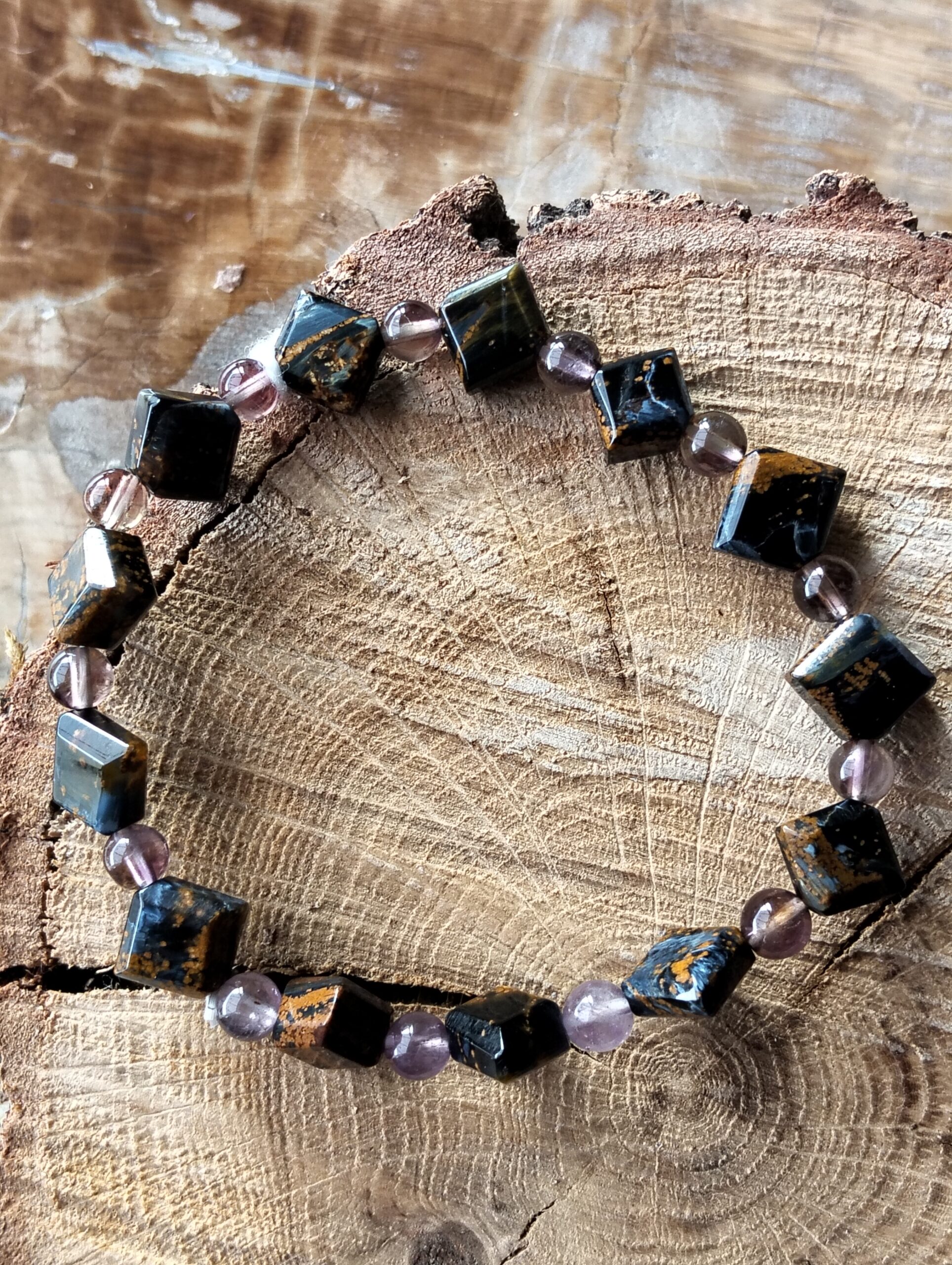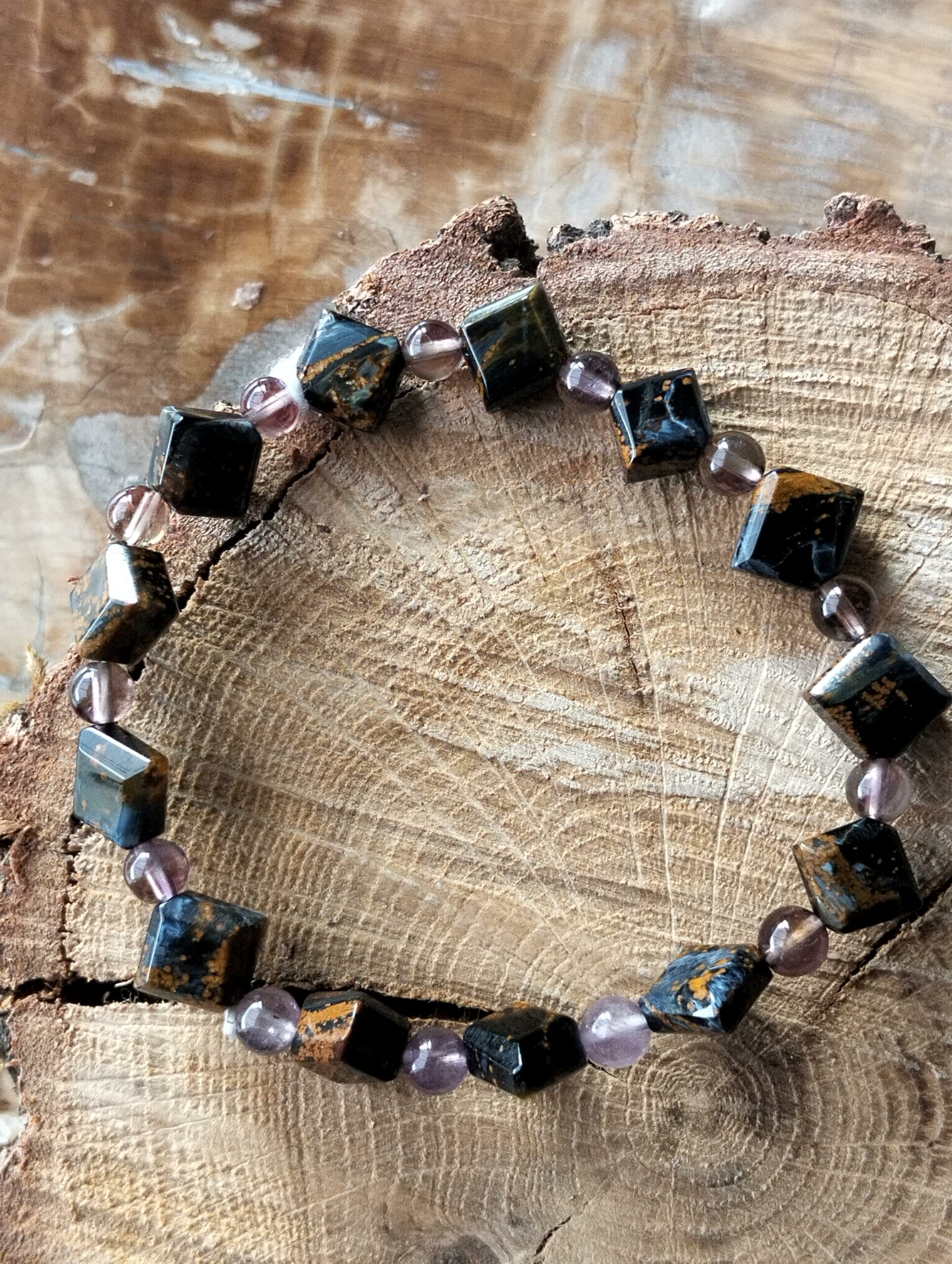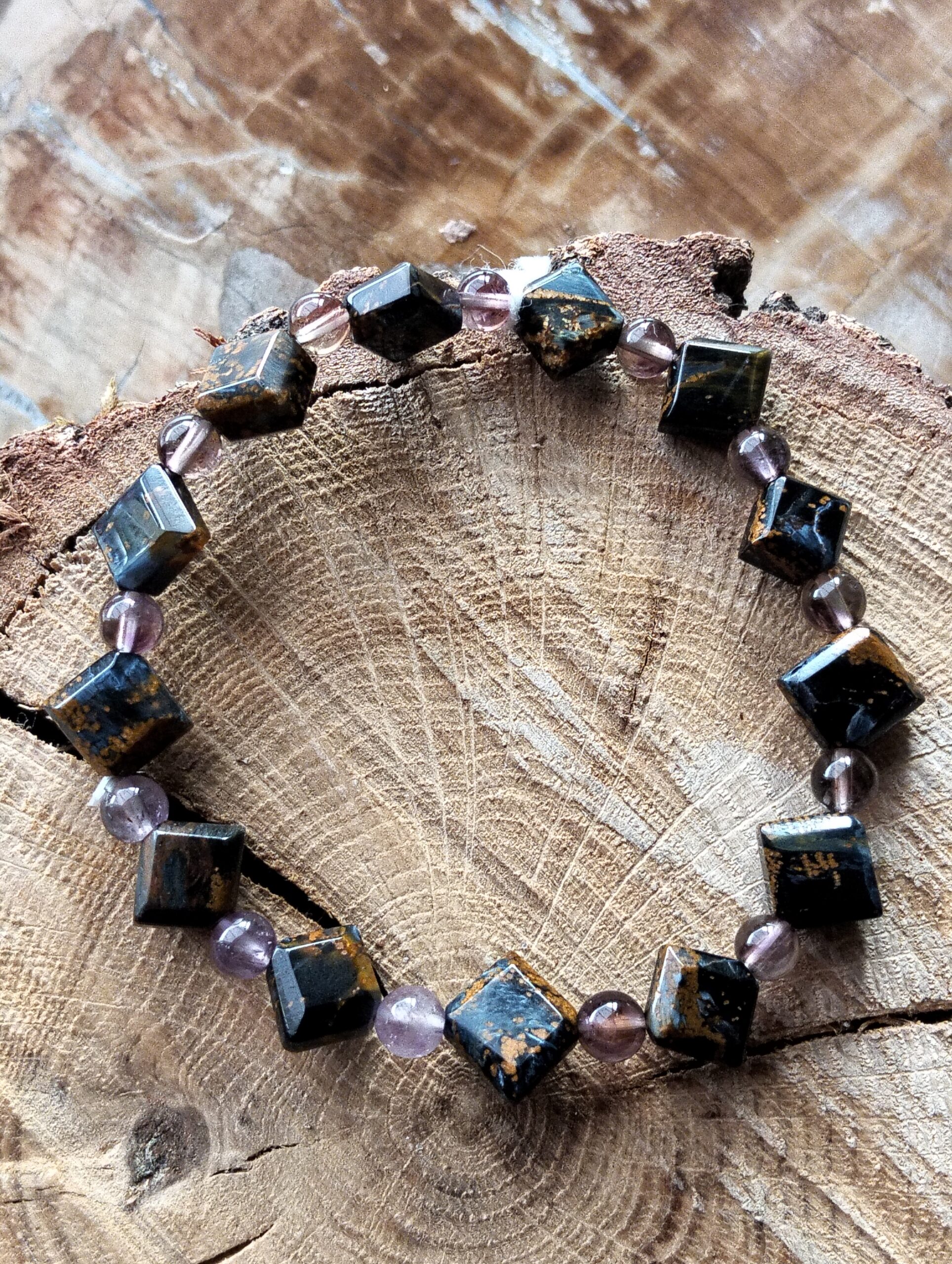 | pietersite | Bracelet en pietersite perles de 6 mm et pierres carrées pour un poignet de 18 à 19 cm. |