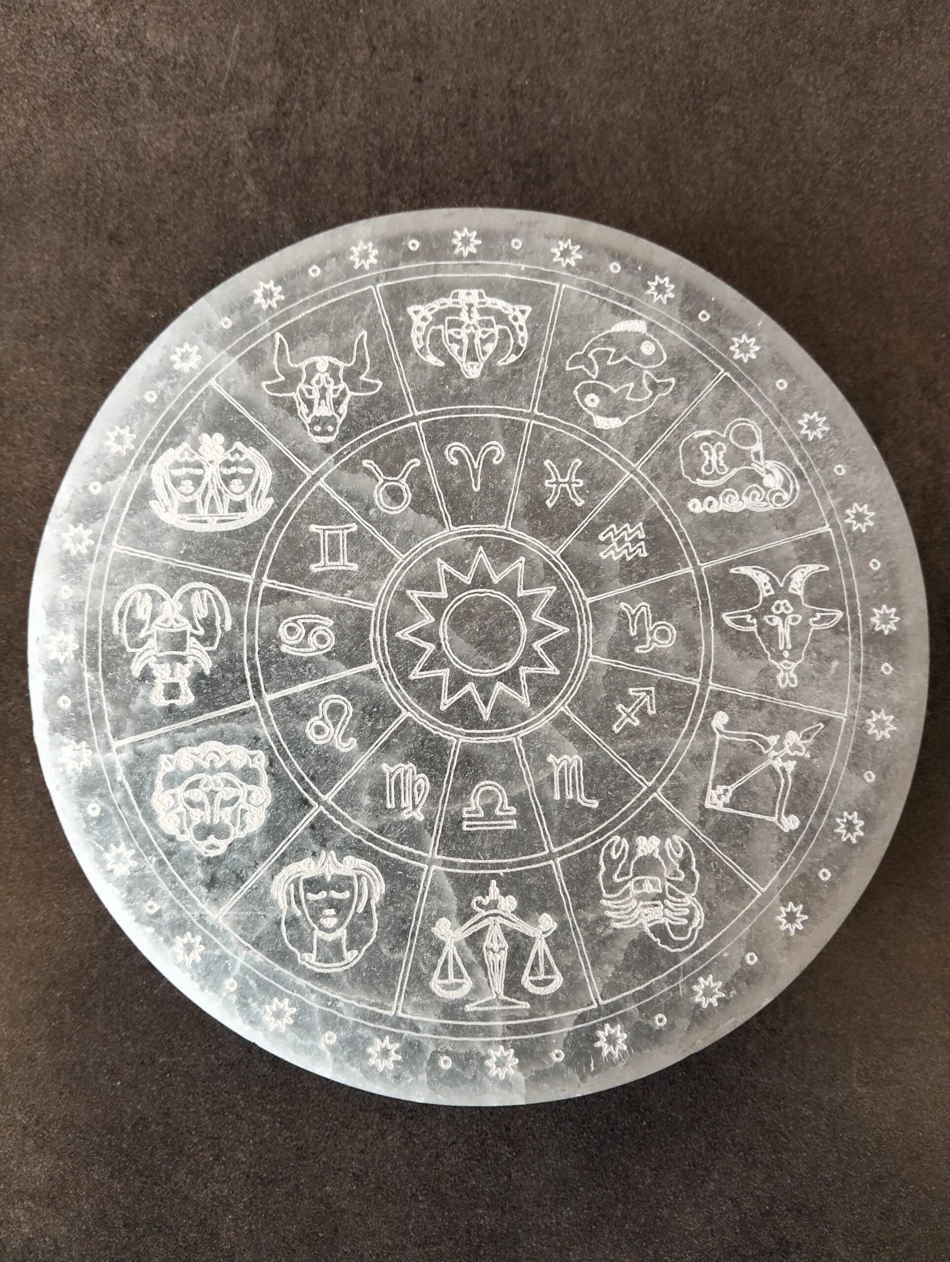 | plaque de rechargement | plaque de rechargement en selenite avec signe zodiacal. |