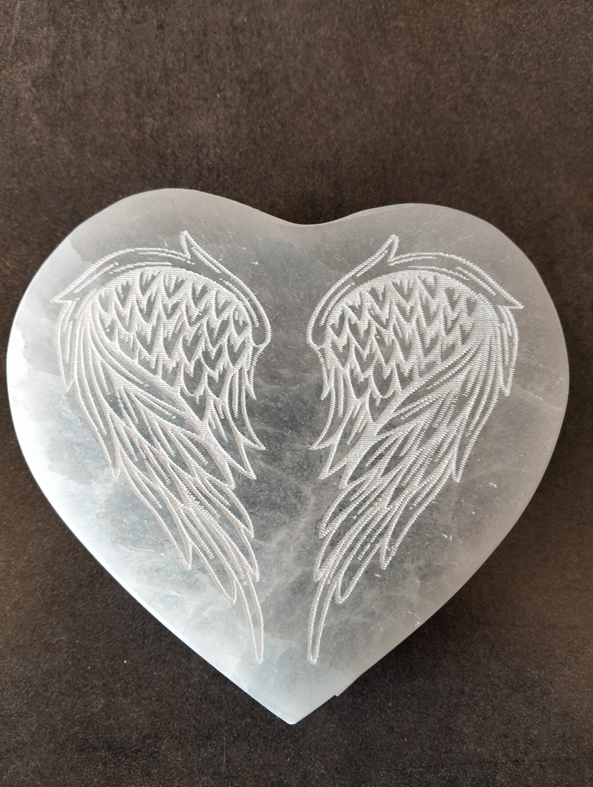 | selenite | plaque forme coeur et ailes d'anges en selenite. |