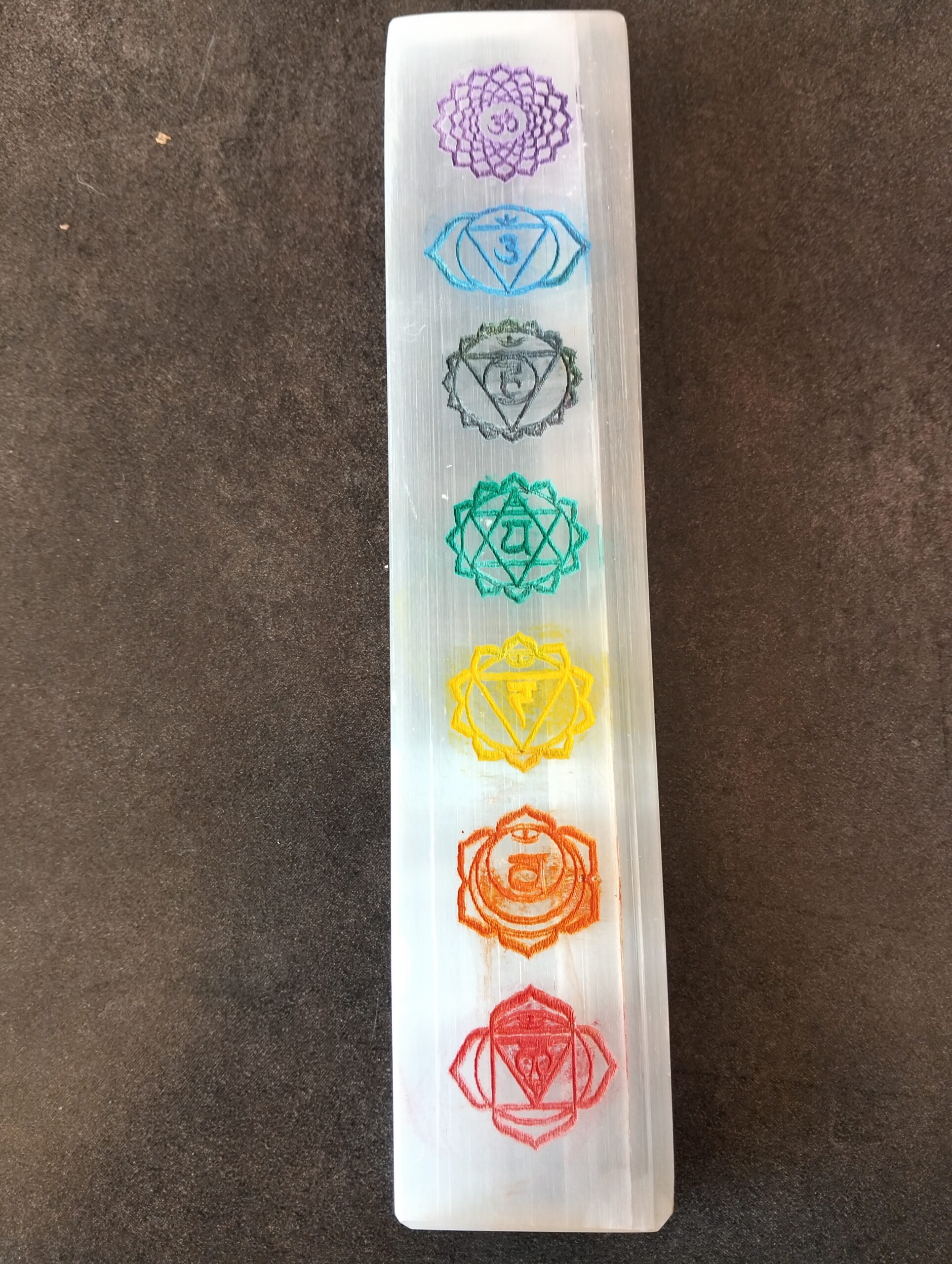 | selenite | plaque de selenite rectangulaire 7 chakras. les 7 chakras sur la même pierre peuvent aider à equilibrer nos emotions en favorisant le debloquage energetique . |