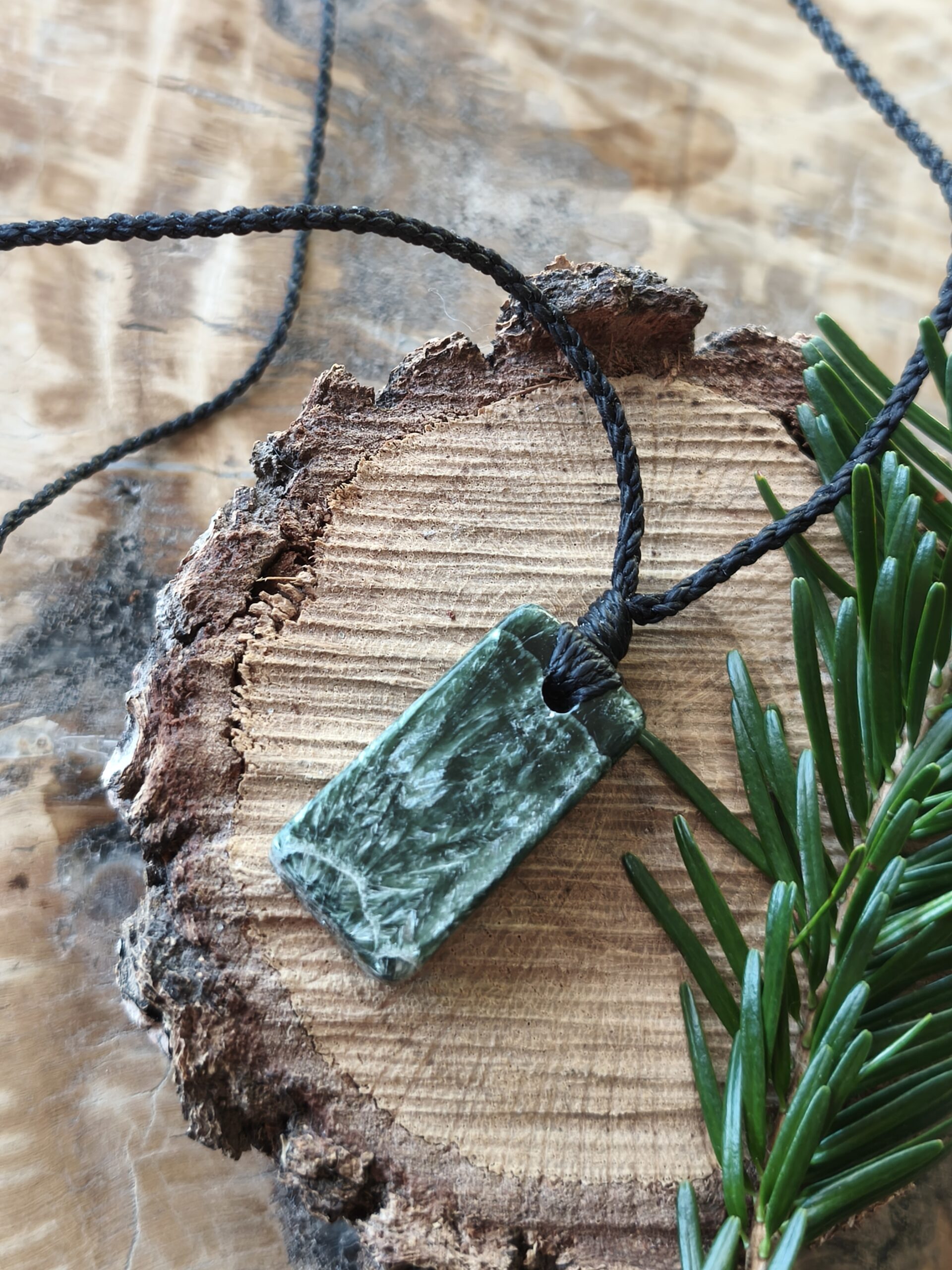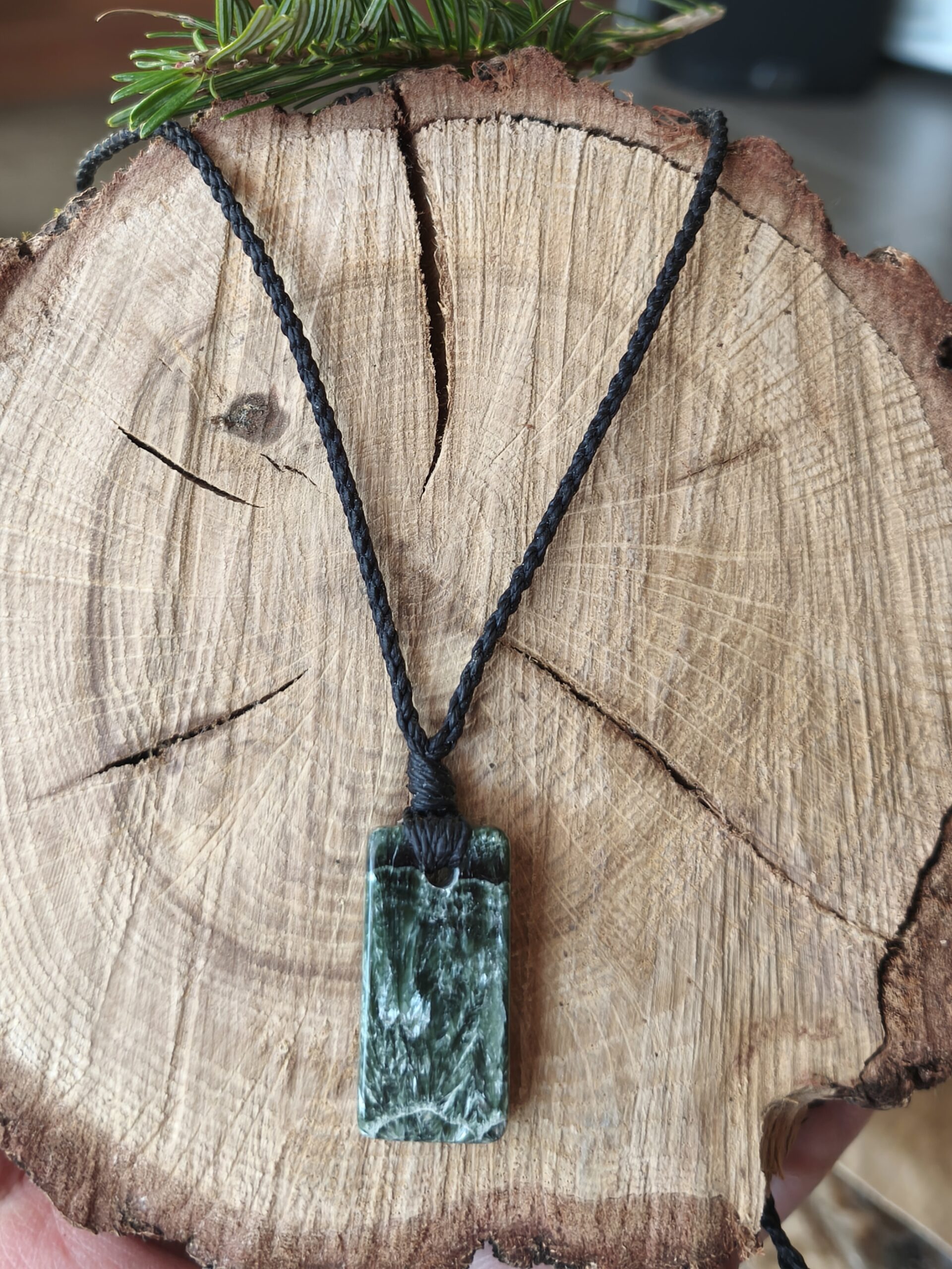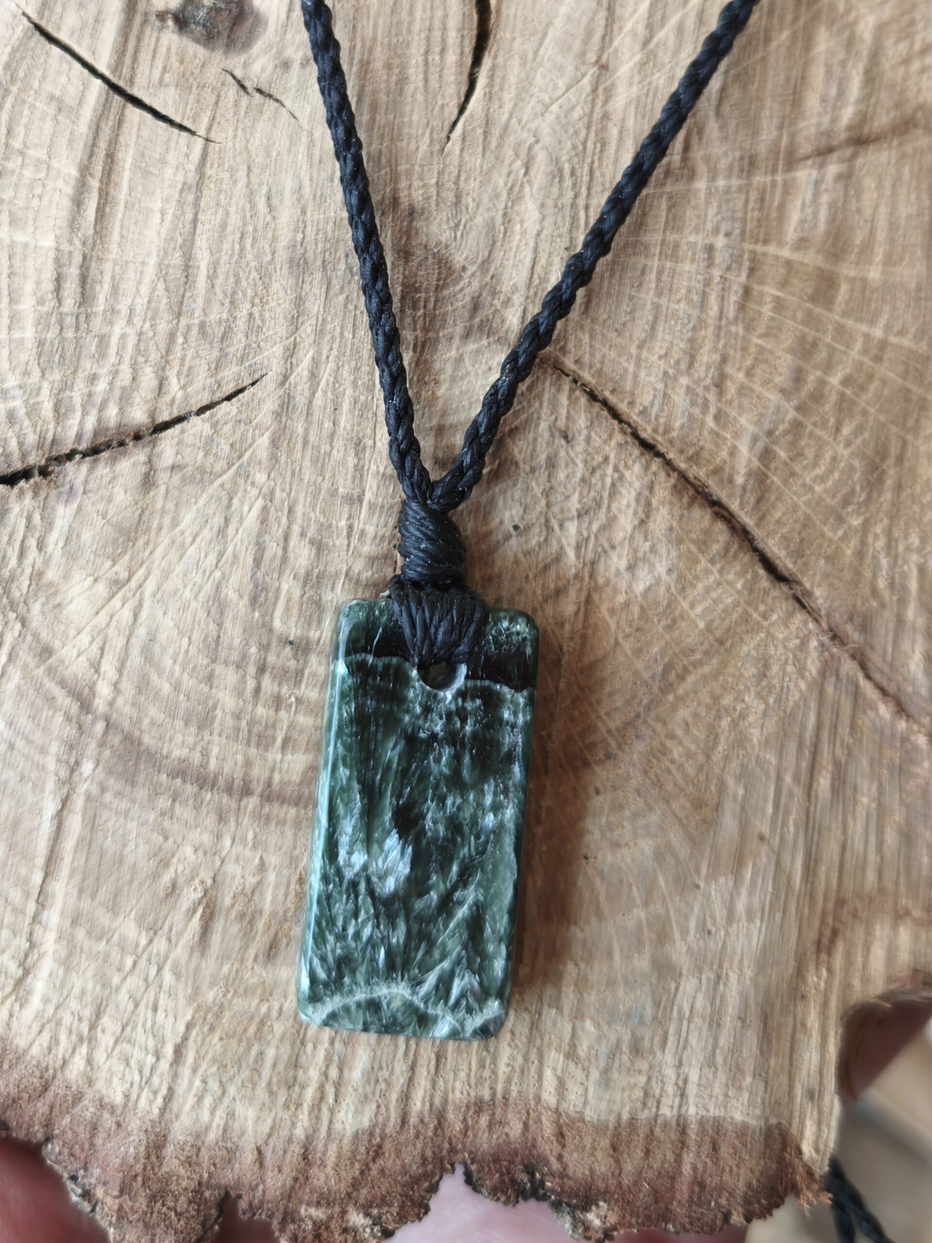 collier sur cordon reglable noir avec belle seraphinite. dimension de la pierre : L 3 cm, l 1,5 cm, epaisseur 0,7 cm.