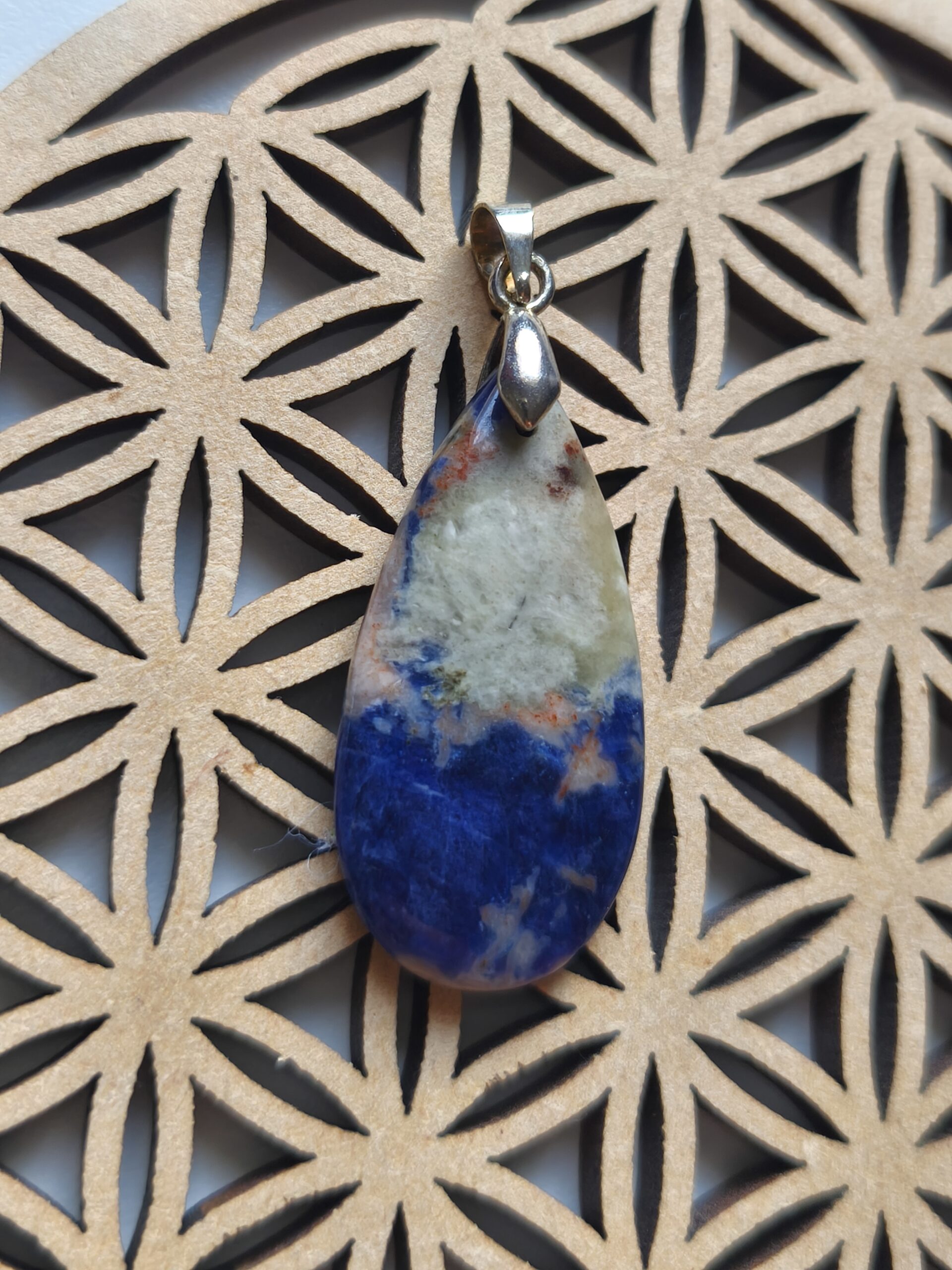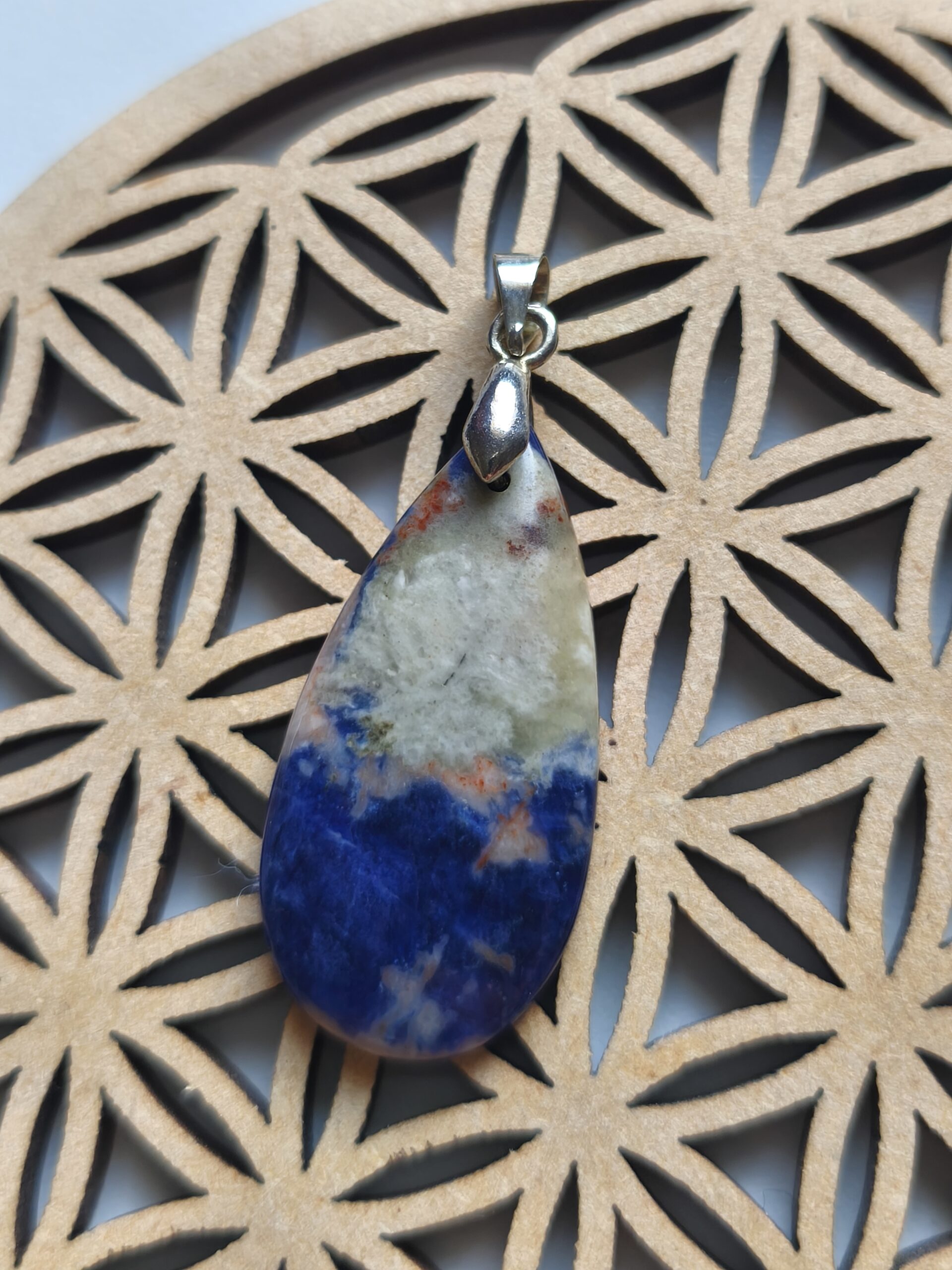 | pendentif | pendentif en sodalite forme goutte, poids 3,5 g La sodalite pierre qui amenuise et dé-rigidifie le mental de l'être, elle offre confiance et le courage… Elle régule la tension artérielle et aide au bon fonctionnement du cerveau… Elle apaise également les douleurs liées aux troubles digestifs… |
