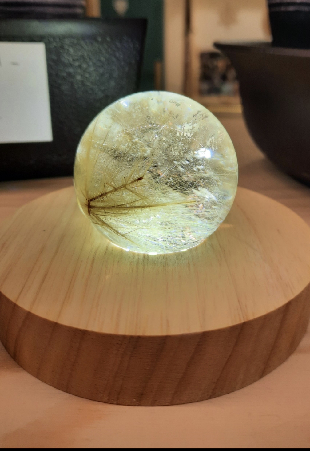 magnifique sphere de quartz rutile de 5 cm de diametre. socle lumineux vendu séparément.