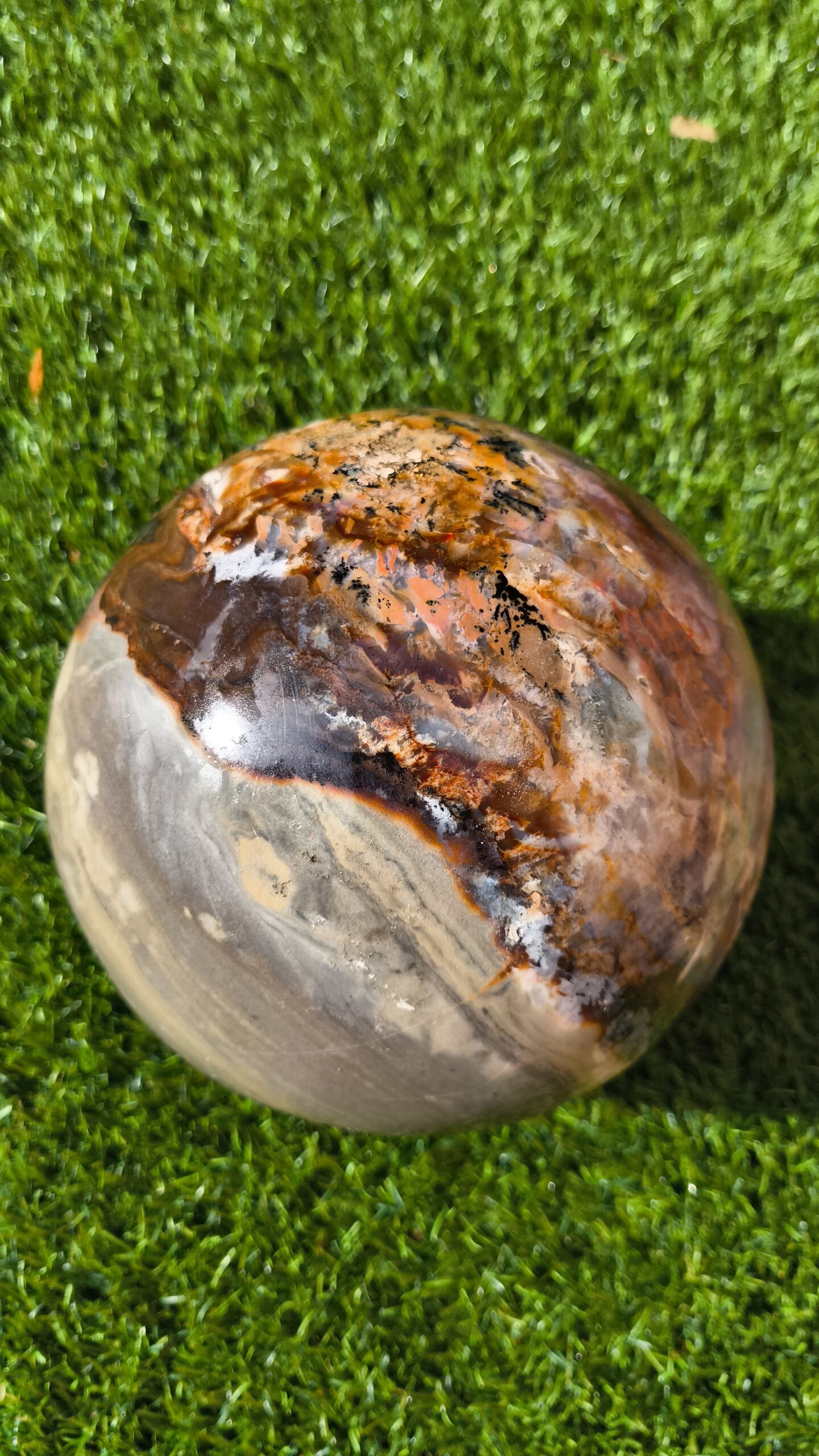 | sphere | magnifique sphere en jaspe et agate de madagascar avec un diametre de 19,5 cm et un poids de 9,200 kg. jaspe / agate a la vertu d'eliminer la colère intérieure et possede aussi la propriété d'effacer tout type de traumatisme emotionnel… |