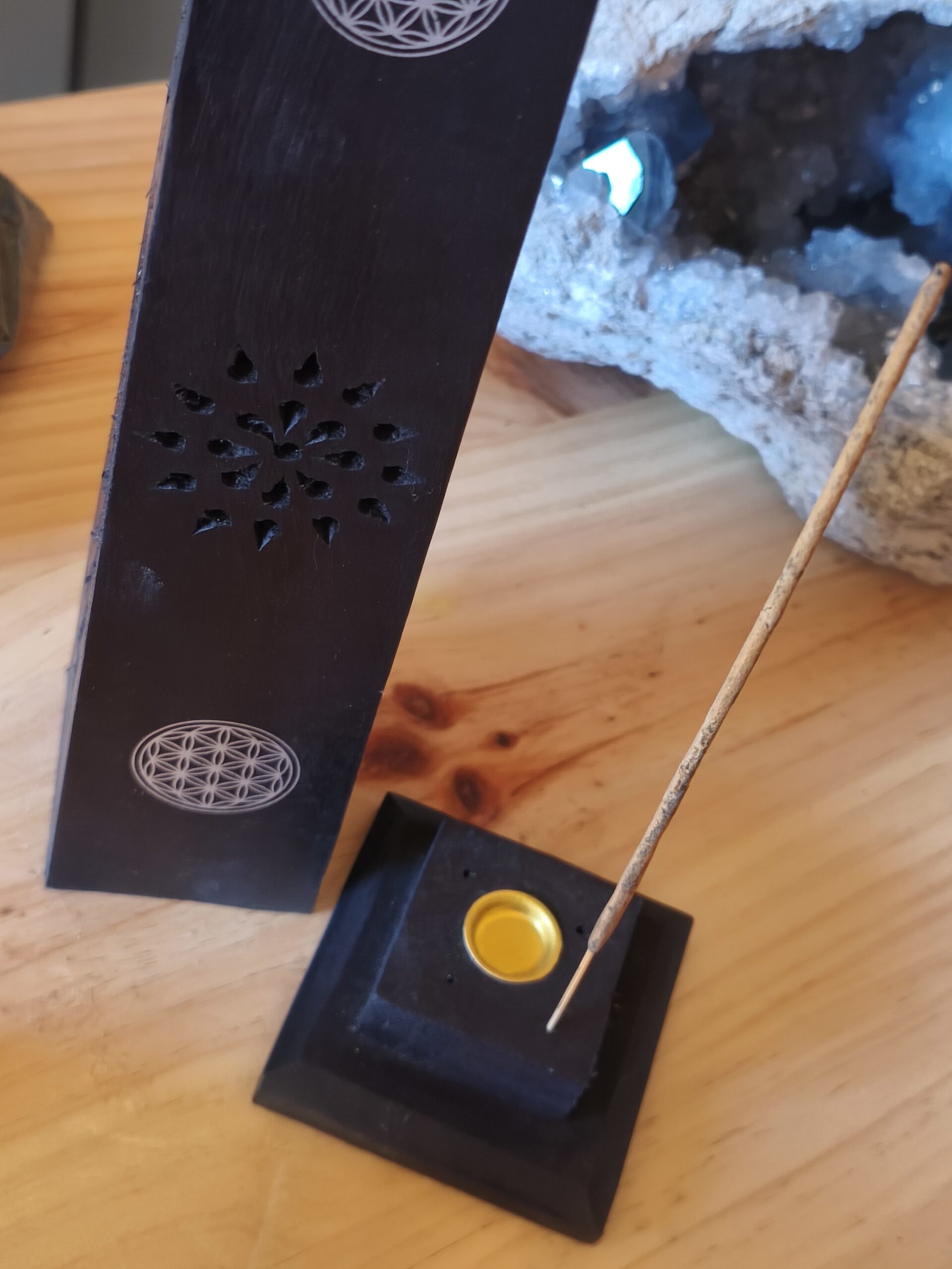 | support a encens | support a encens vertical pour encens bâton et cône, noir et fleur de vie. |
